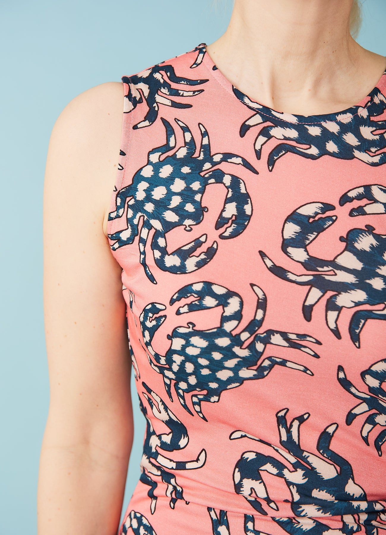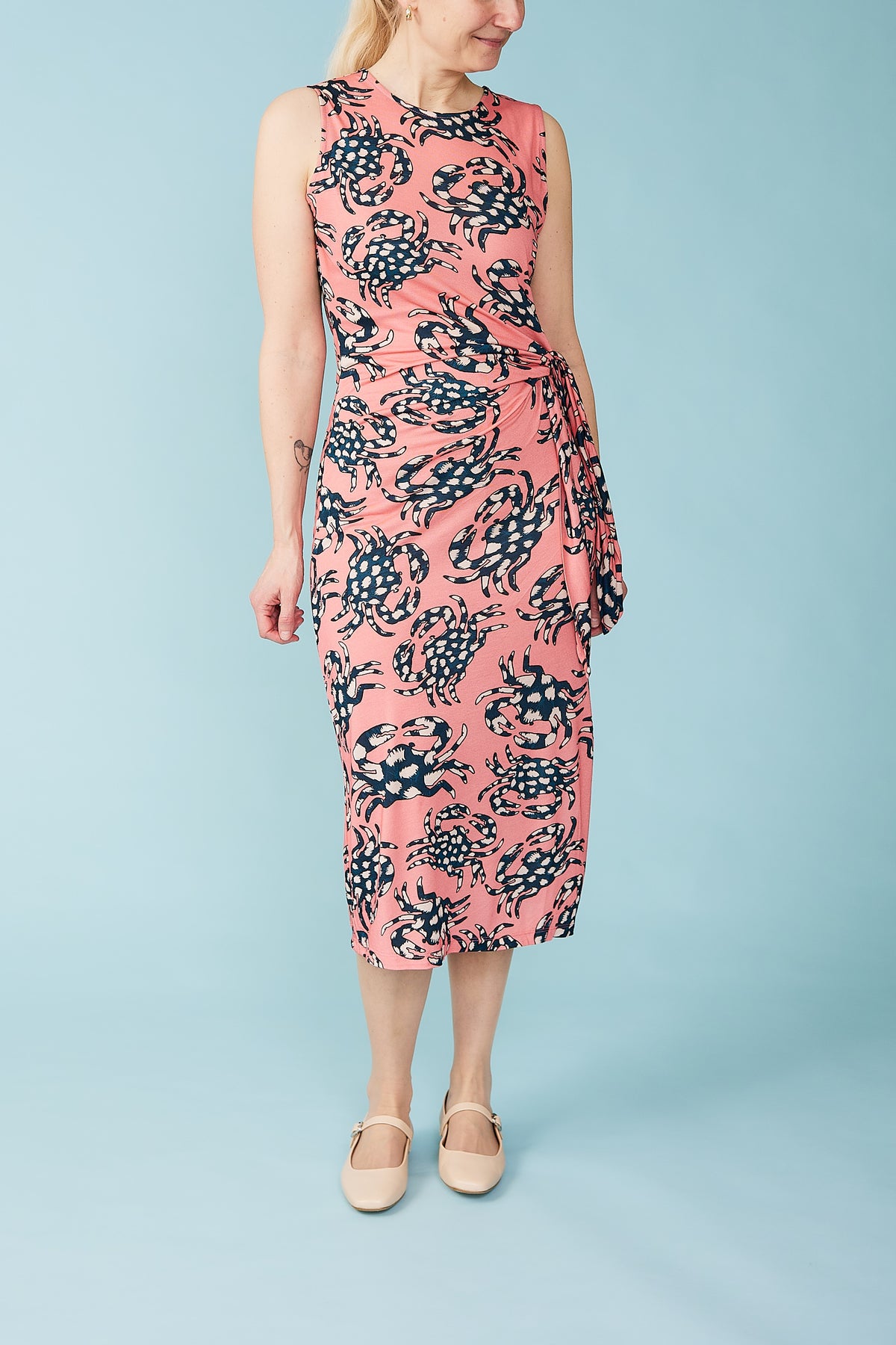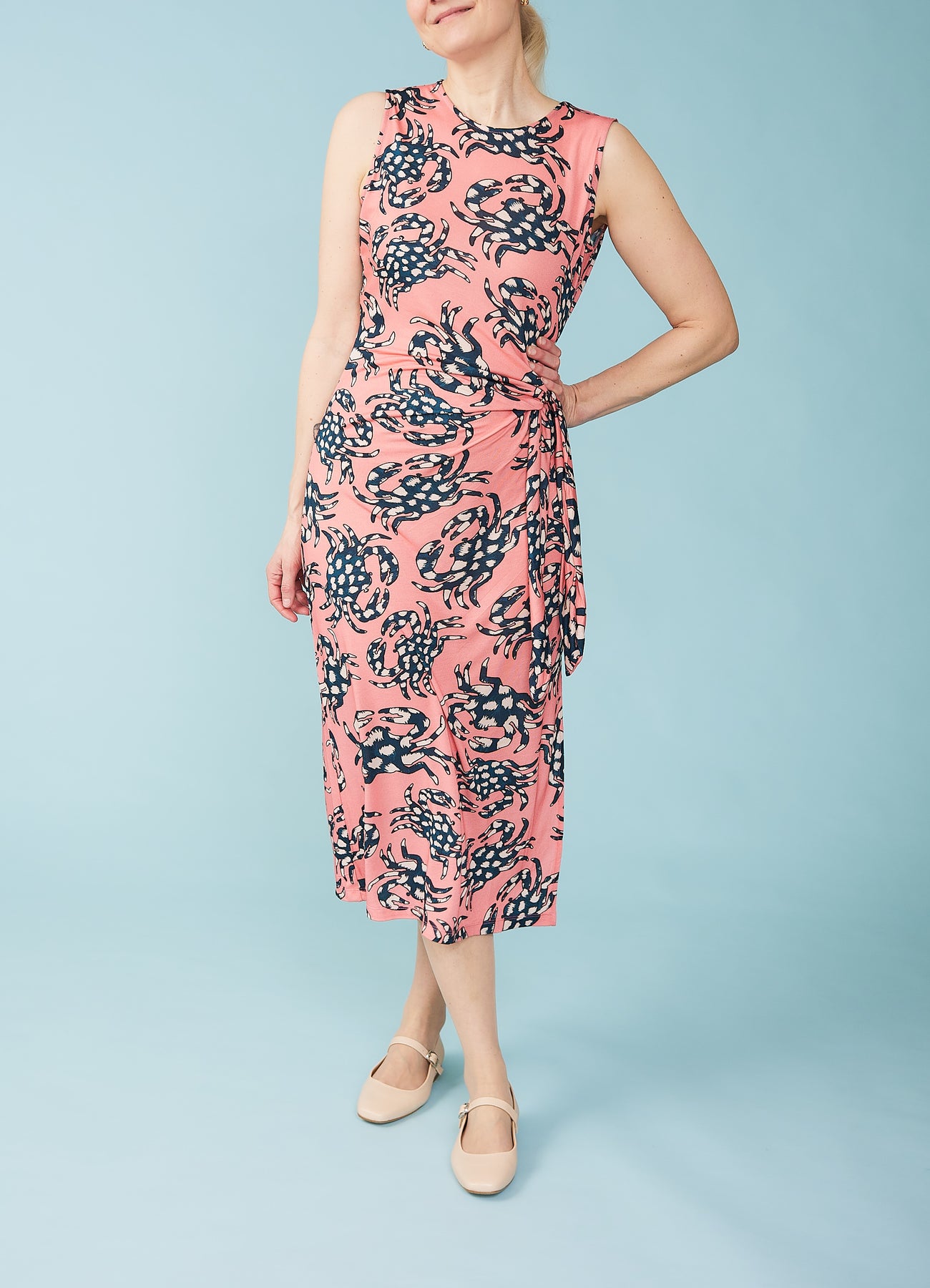 Lækker, ærmeløs jerseykjole med et skønt mønster af prikkede krabber. Kjolen har en fin drapering henover maven, som bindes i den ene side. Den er laver i silkebød viskose og føles skøn af have på.