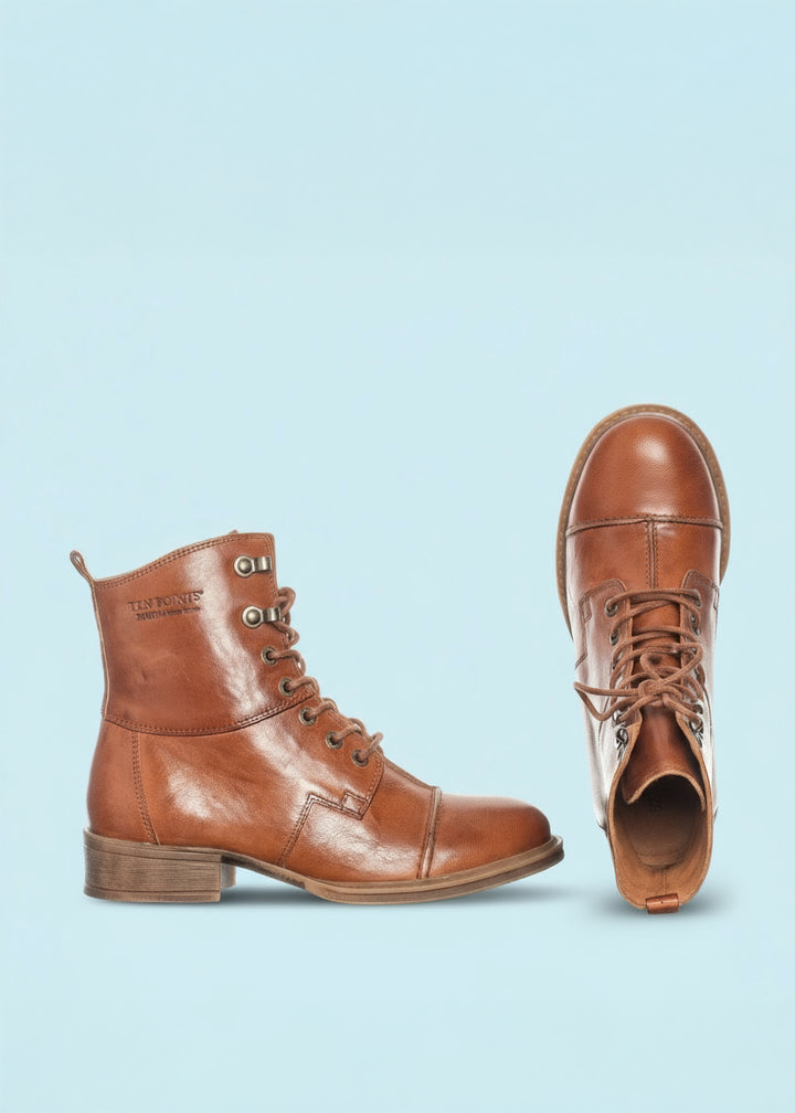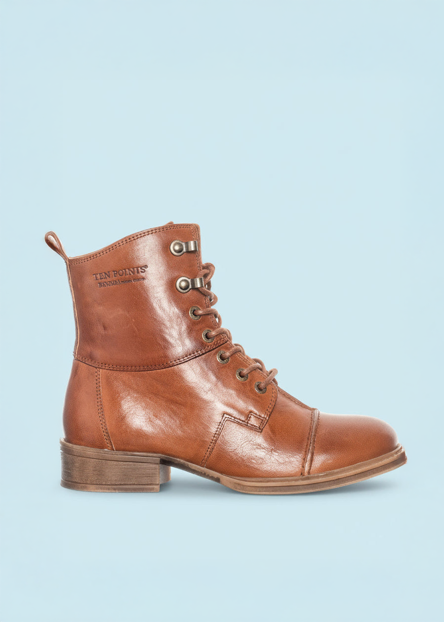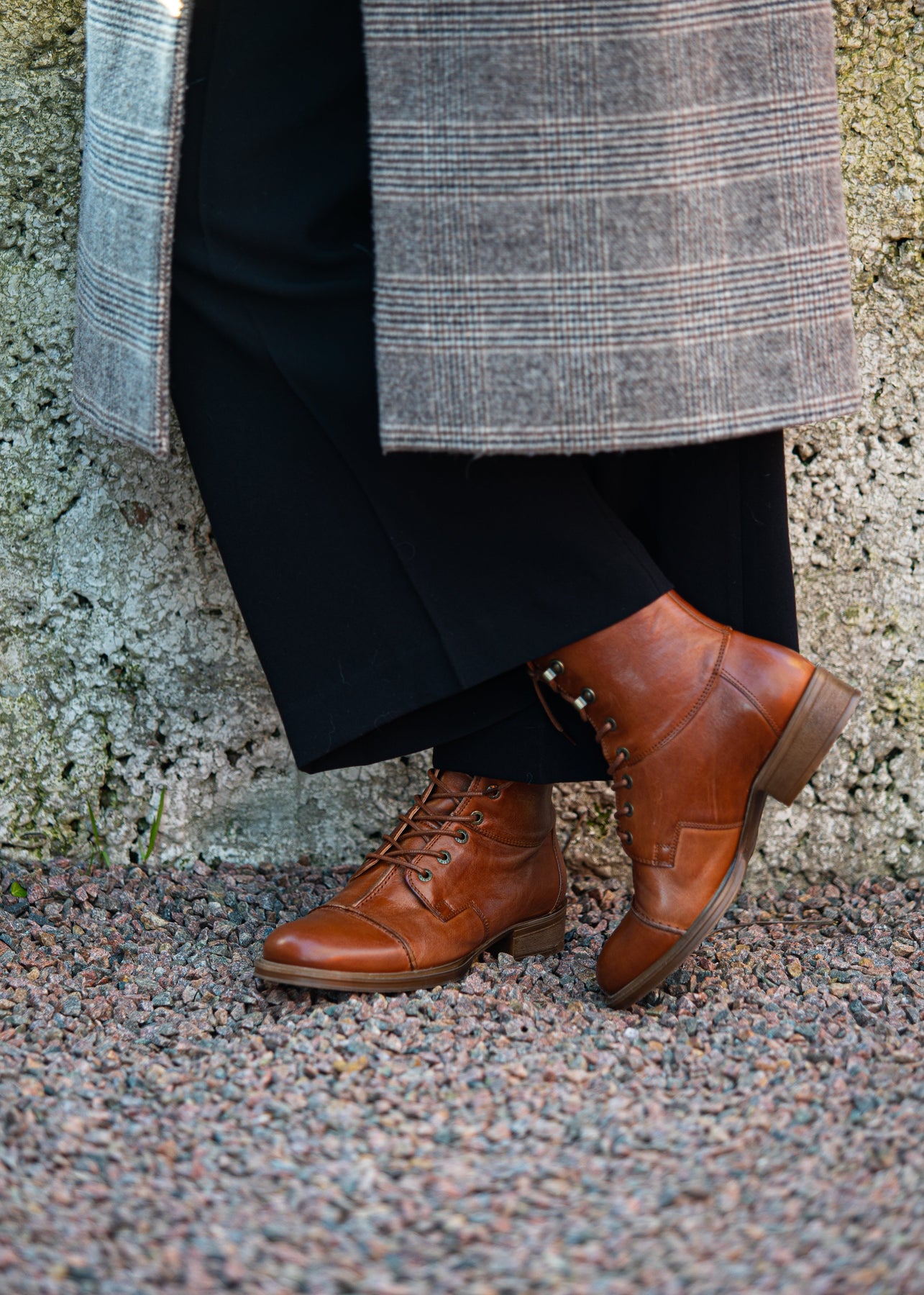 Klassisk snørestøvle med rund snude. Støvlerne er de perfekte all-round støvler, som kan klare lidt af hvert samtidig med, at de ser fine ud med strømpebukser og kjole. De er lavet af kromfrit læder med en lækker gylden cognacfarve, som bare bliver smukkere og smukkere, jo mere du bruger dem. Støvlerne er ikke foret, så de kan anvendes året rundt.
