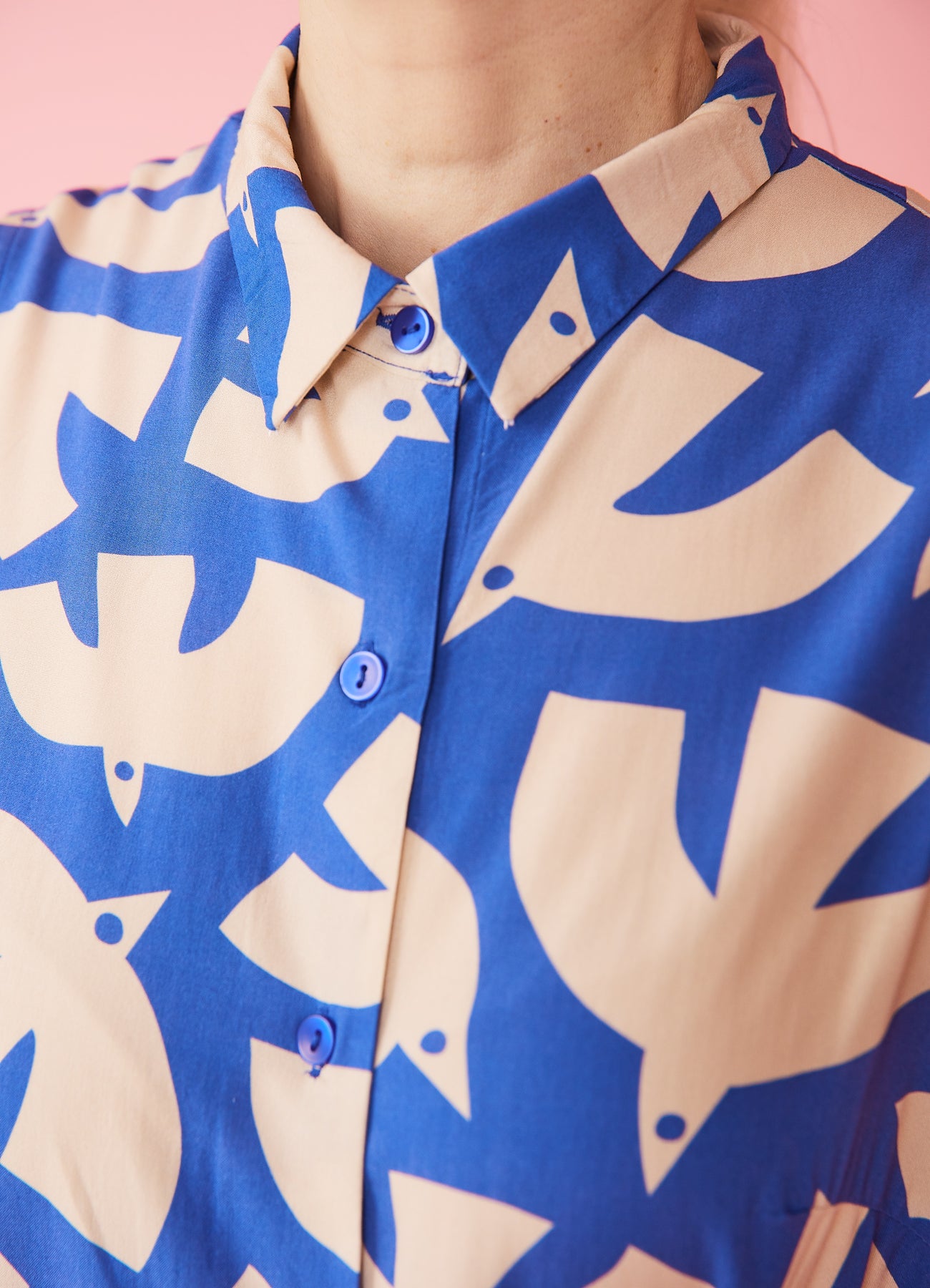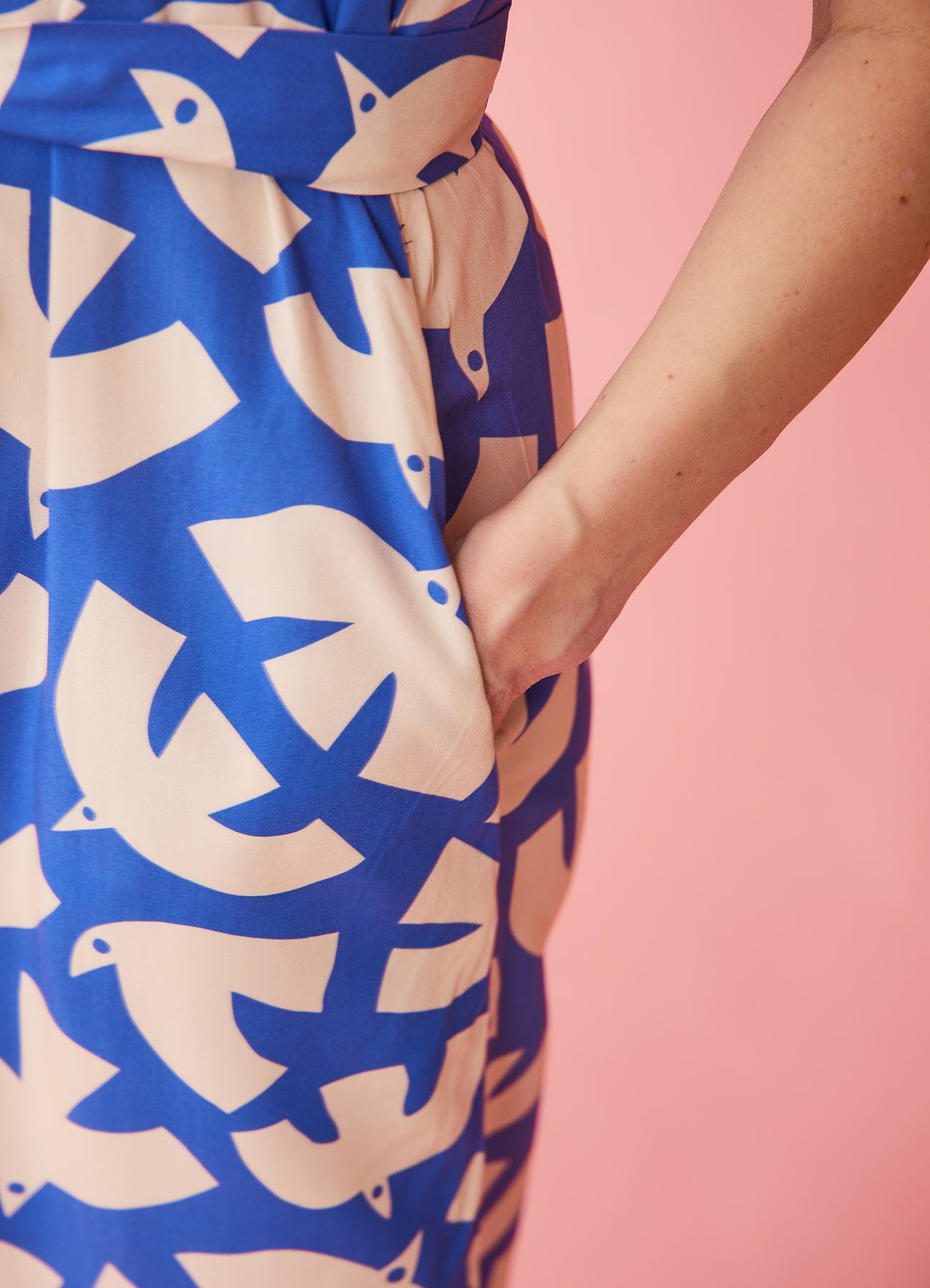 Lækker, ærmeløs skjortekjole i silkeblød viskose. Kjolen har det smukkeste grafiske mønster med cremefarvede fugle på en klar, blå baggrund. Kjolen er ikke syet ind i taljen, så du kan selv justere den med bindebåndet eller bruge den uden.