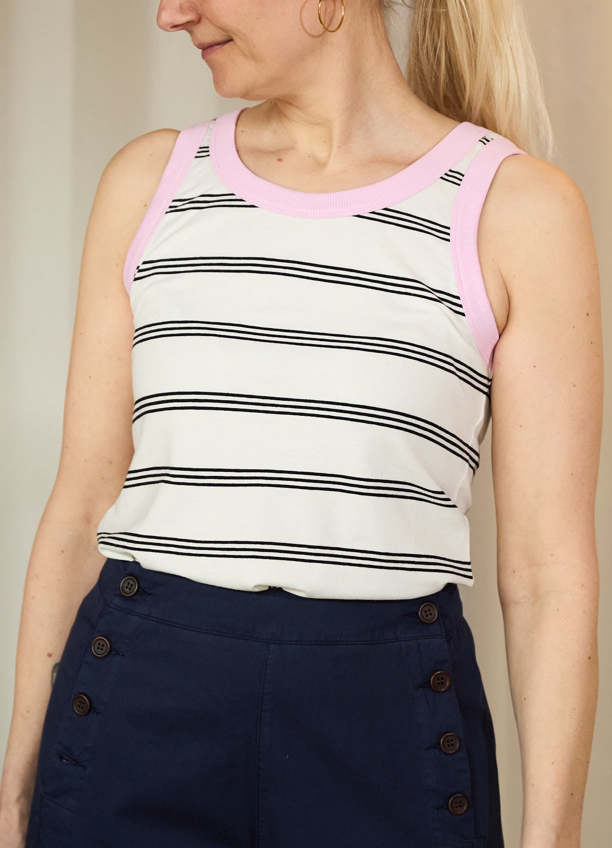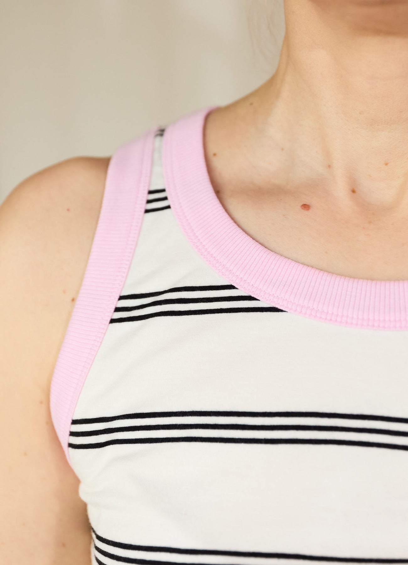 Fin, ærmeløs sommertop med sorte striber og pastel-lyserøde kanter. Toppen er lavet i en lækker kraftig bomuldsjersey med tætsiddende pasform og masser af stretch.