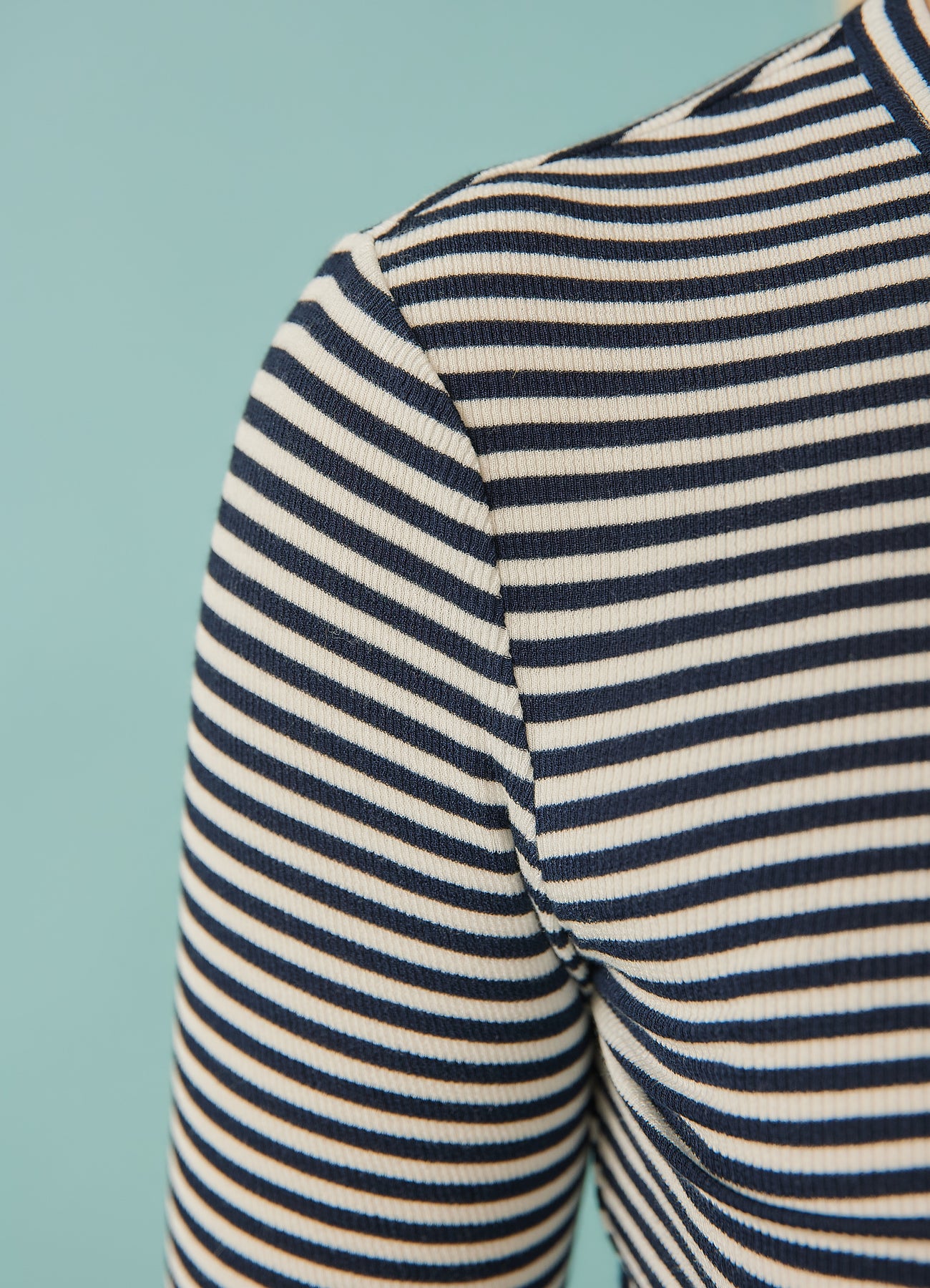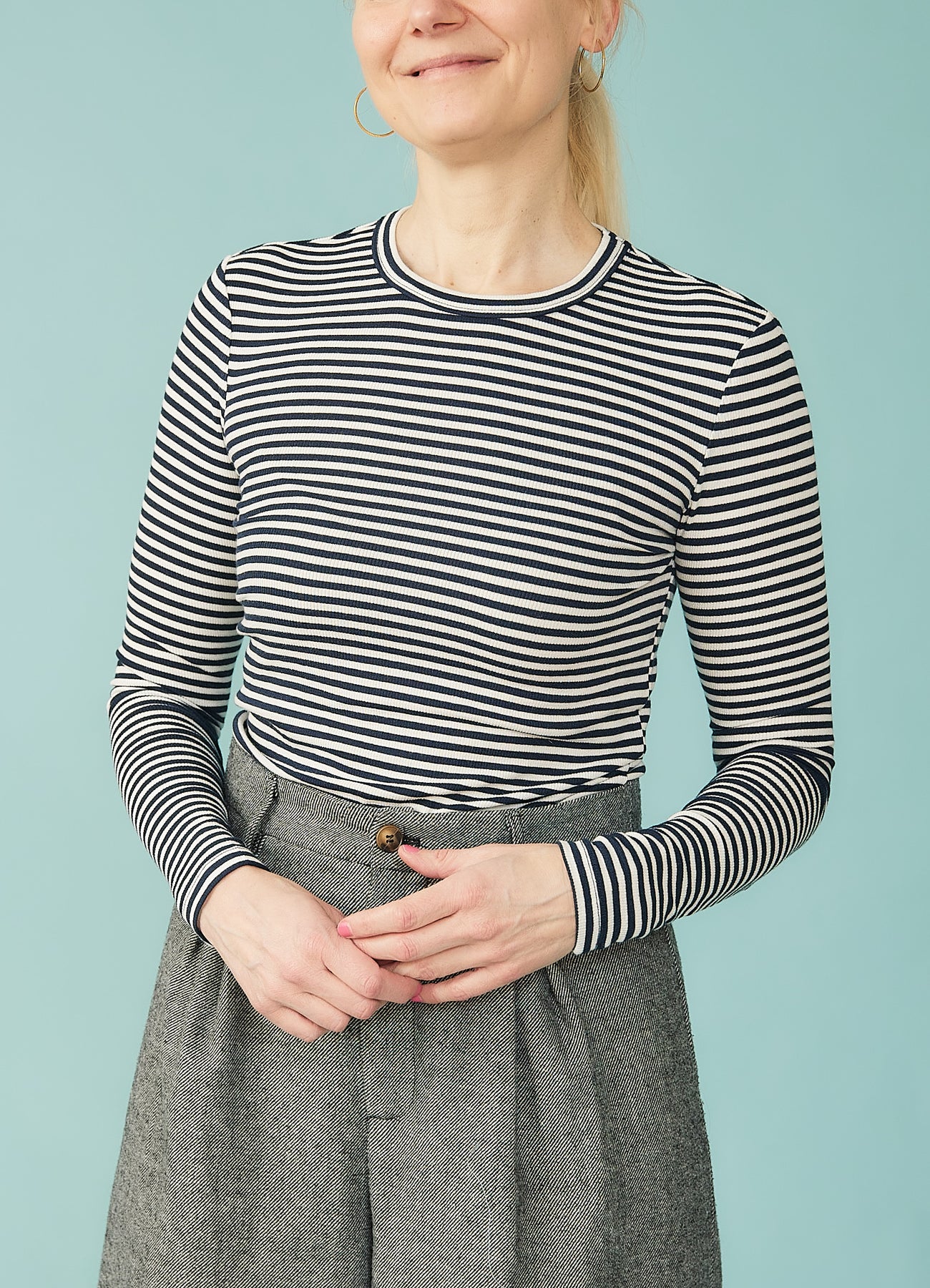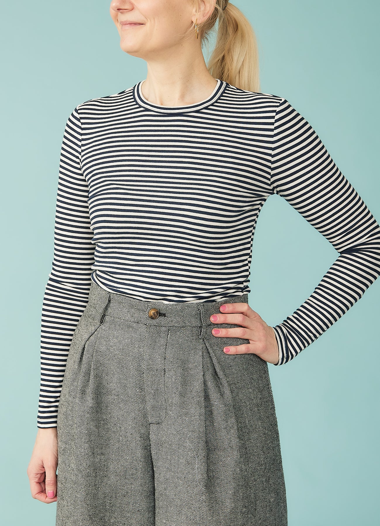 Super lækker stribet basisbluse fra danske Soft Rebels. Lavet i silkeblød modal (TENCEL™), som er et blødt og åndbart materiale lavet af træfibre. Blusen er ribstrikket og sidder tæt til kroppen - perfekt til hverdag sammen med vores fyldige nederdele og højtaljede bukser.