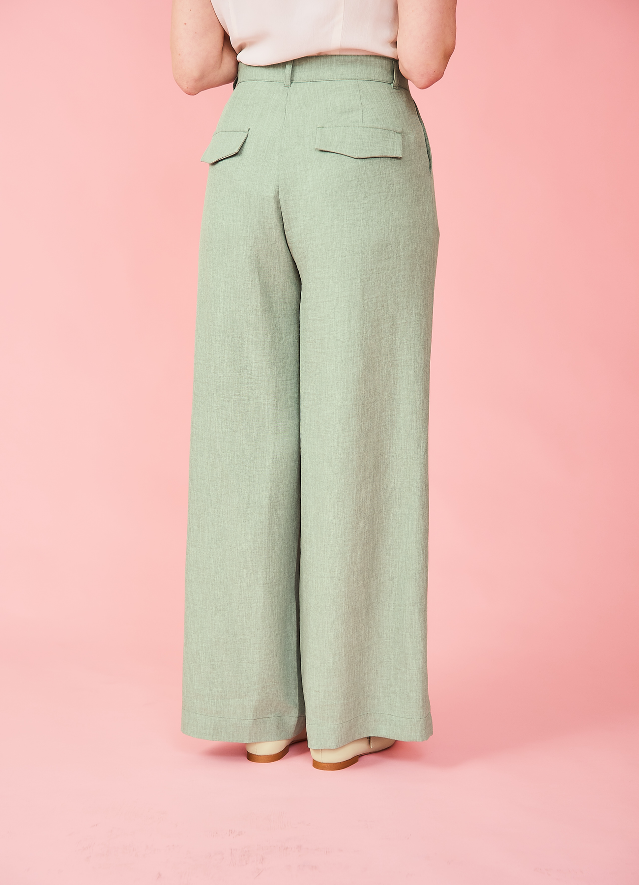 Fine, relaxed trousers in a nice, lightweight quality and a beautiful light green colour. The trousers have a high waist, with pockets at the sides and back.