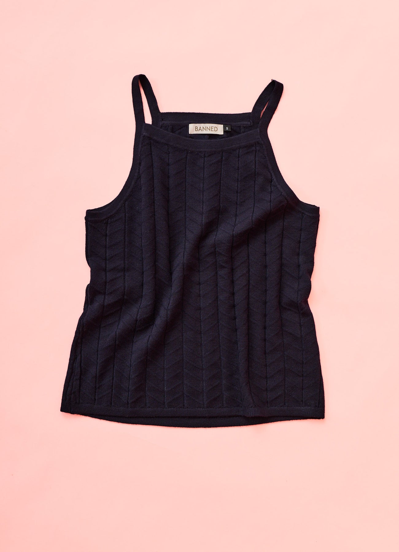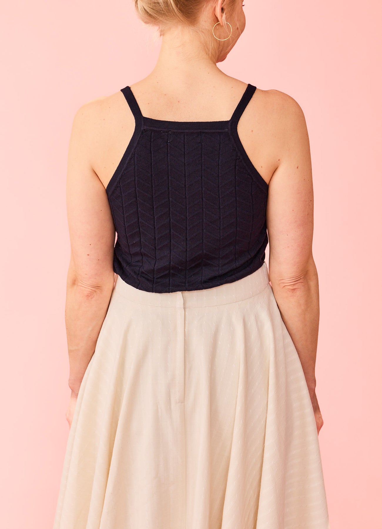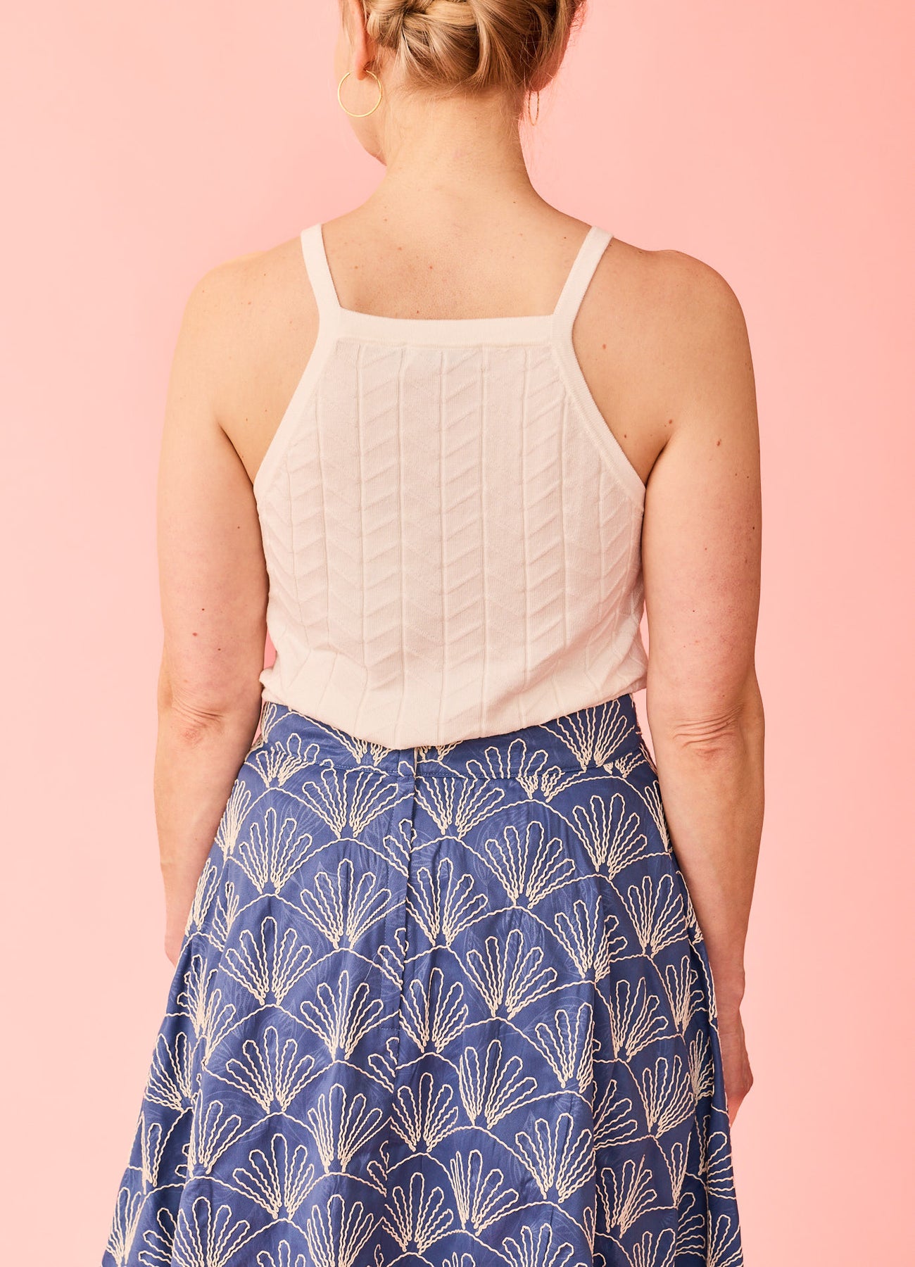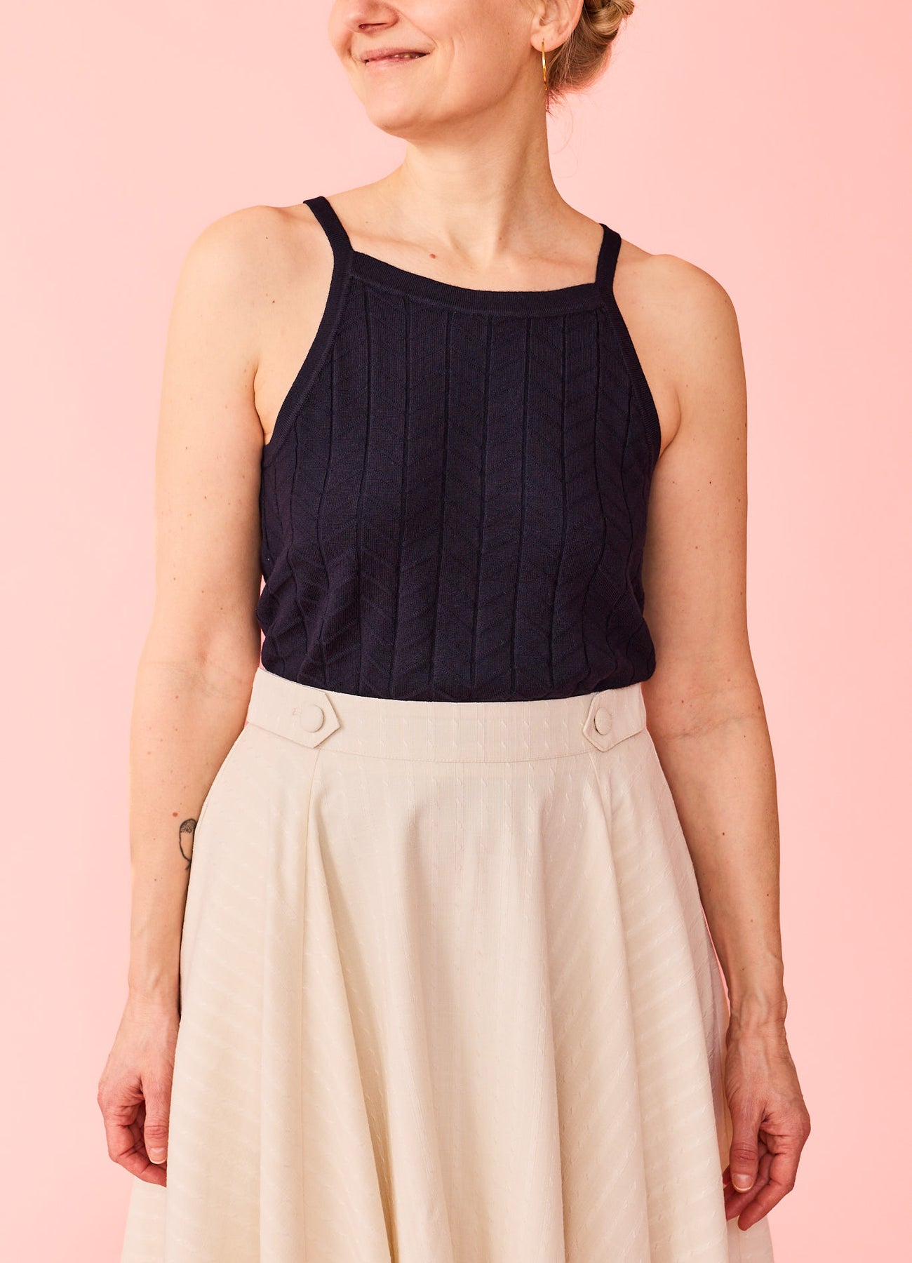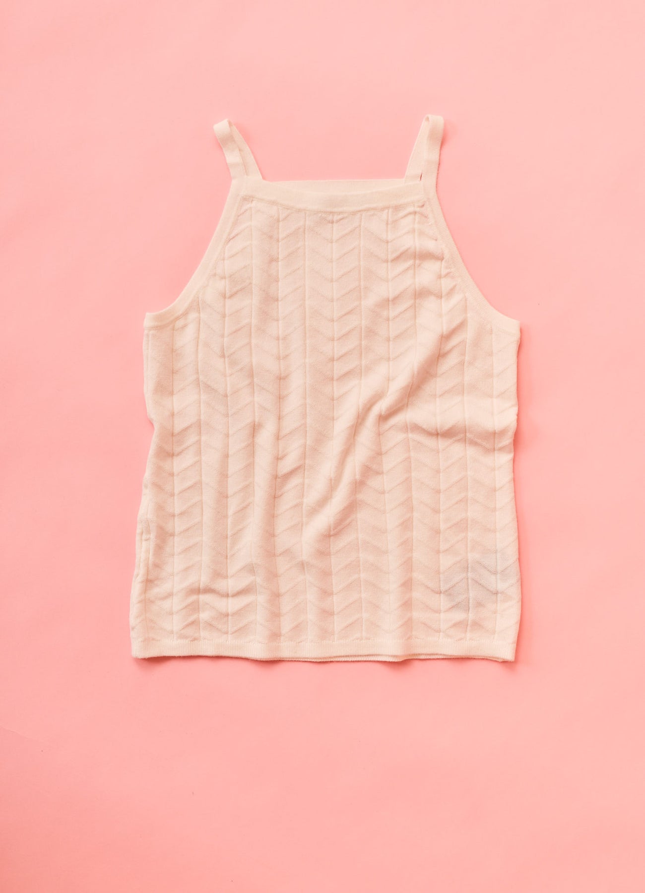 Strikket sommertop med stropper og fint sildebensmønster. Strikket i en blød viskose-blanding, som føles skøn at have på. Den perfekte top til sommerens basisgarderobe.