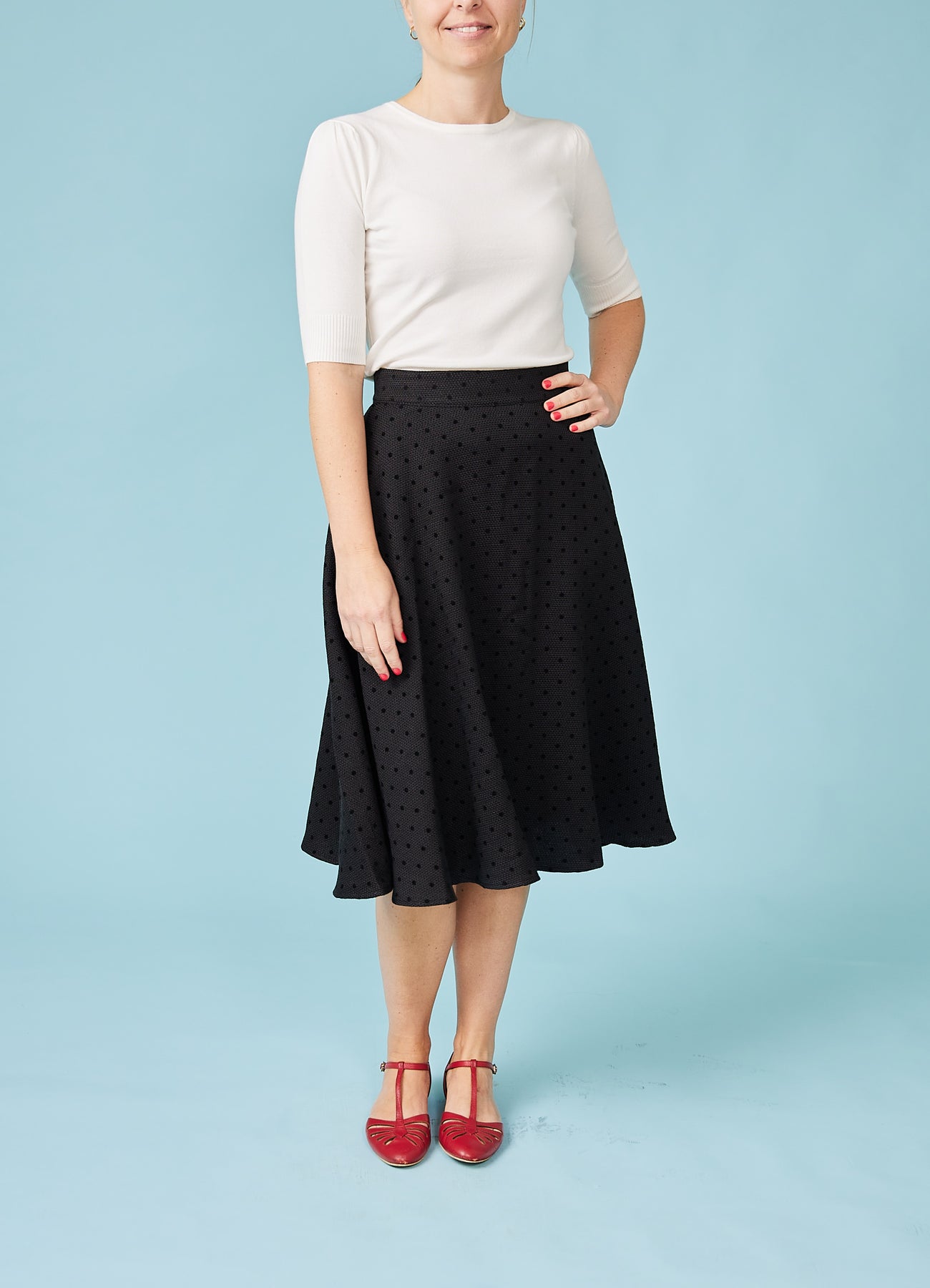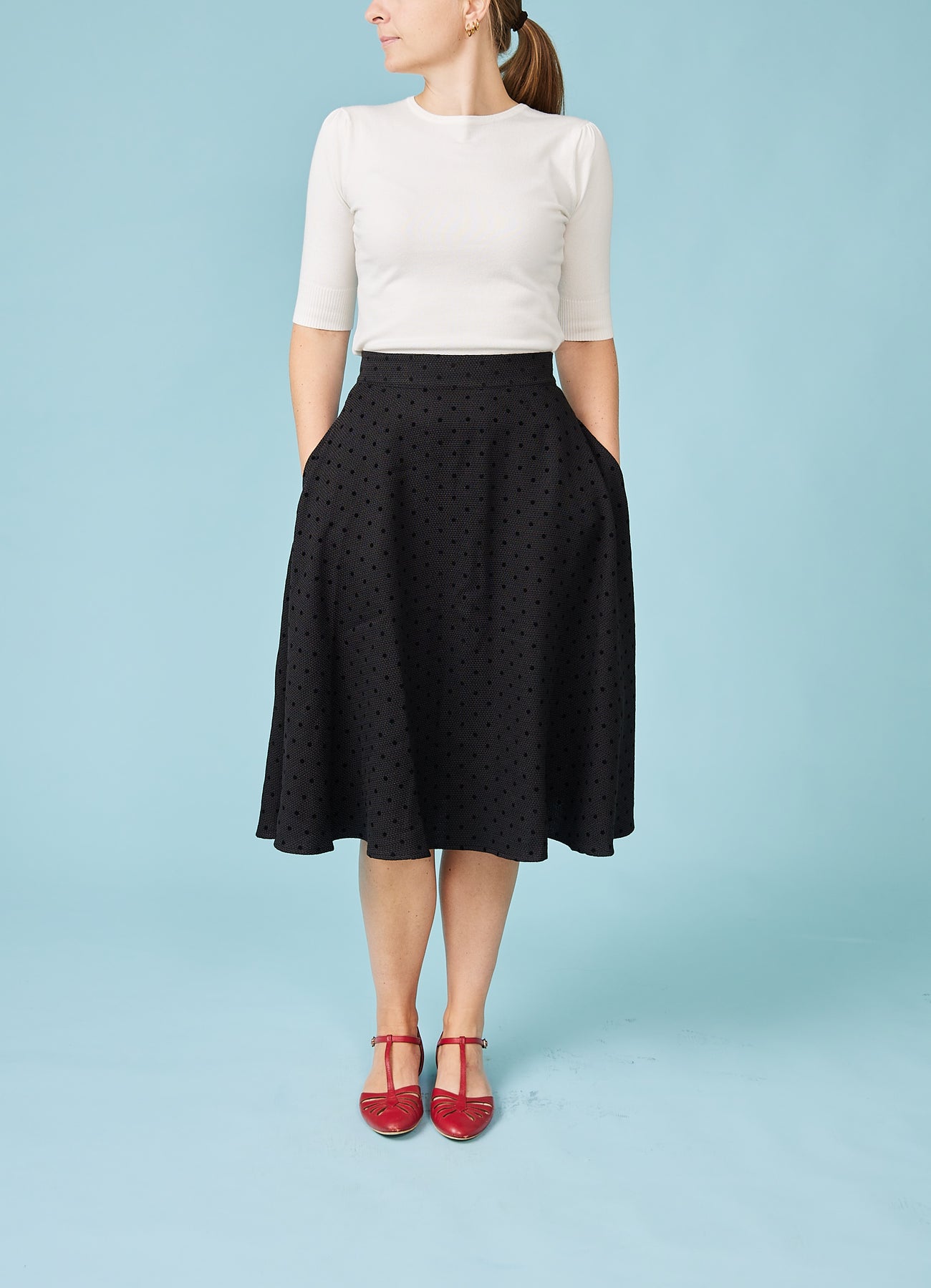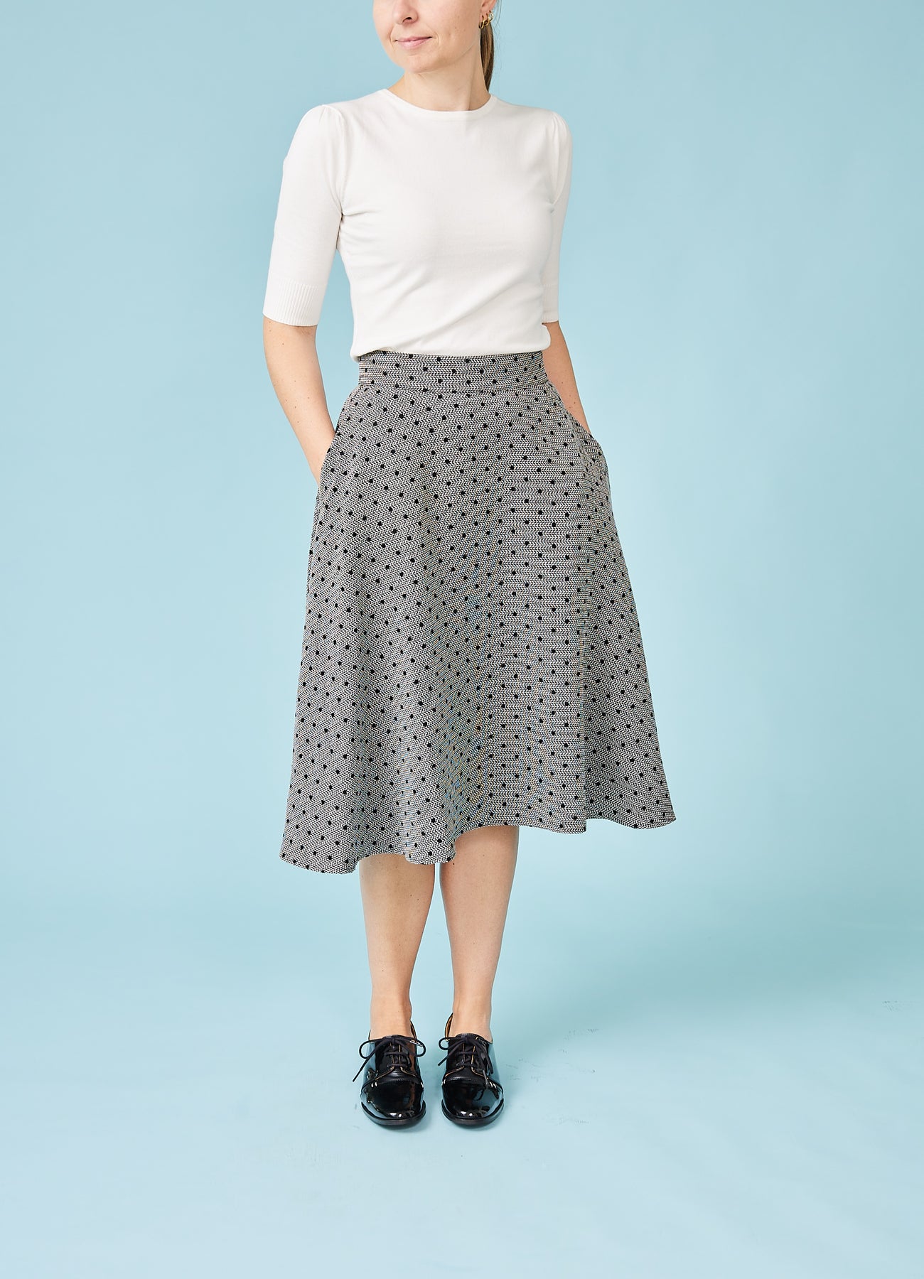 Lækker swingnederdel i en kraftig, men blød kvalitet med tydelig vævning og små fine prikker.