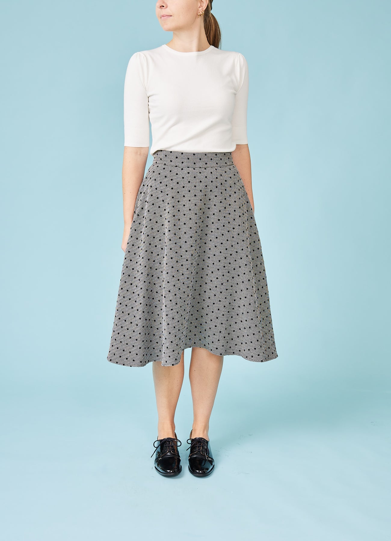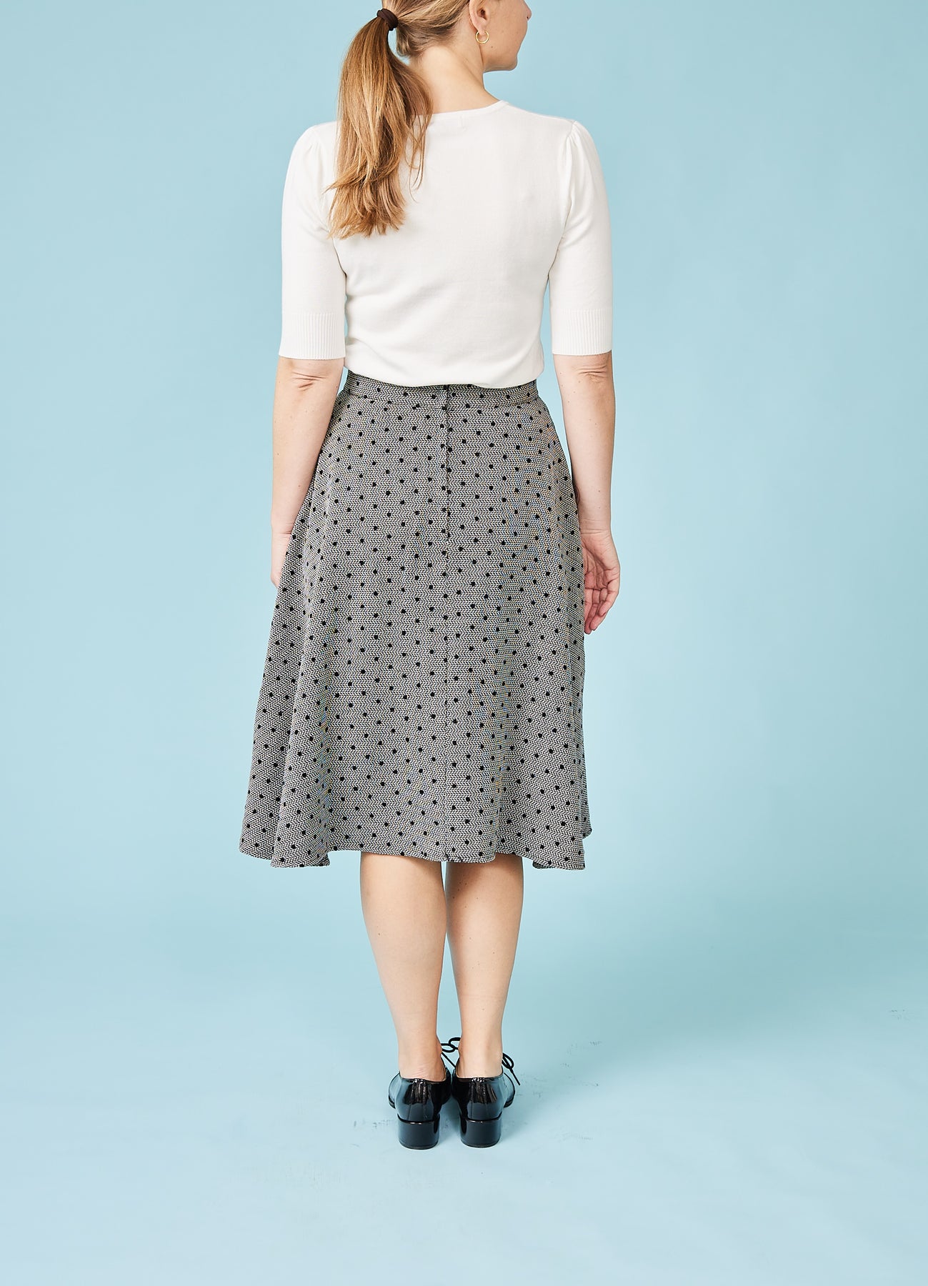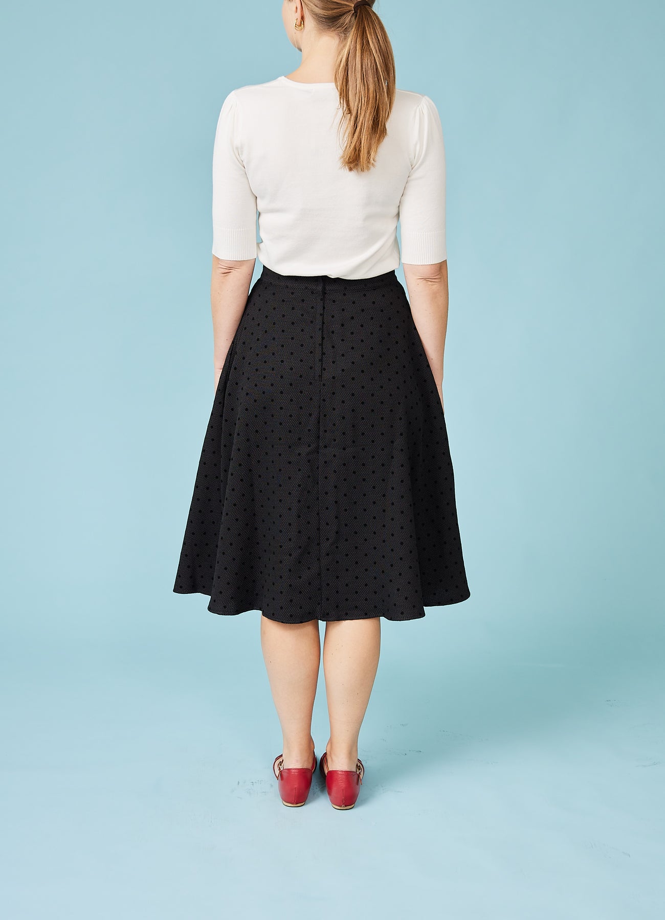 Lækker swingnederdel i en kraftig, men blød kvalitet med tydelig vævning og små fine prikker.