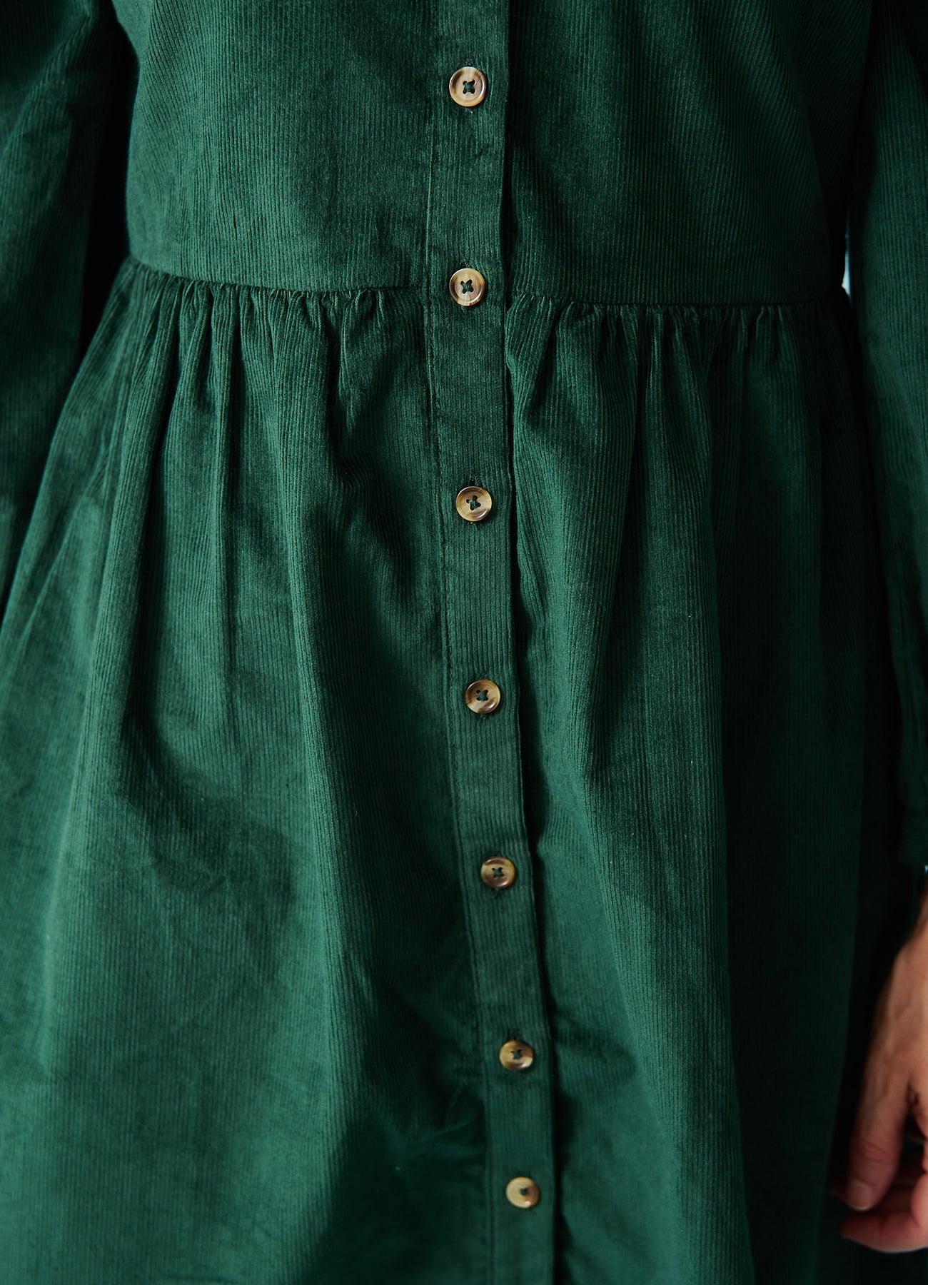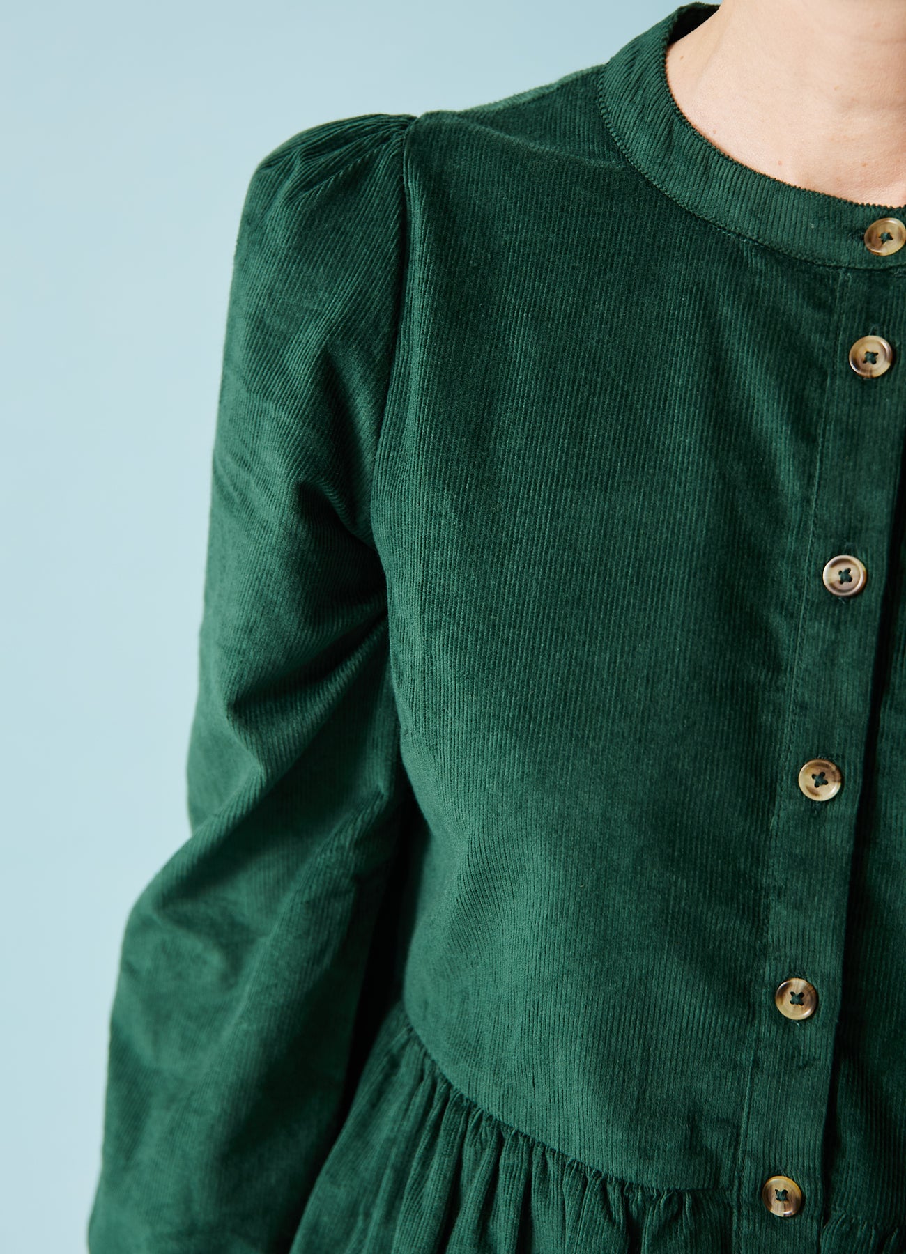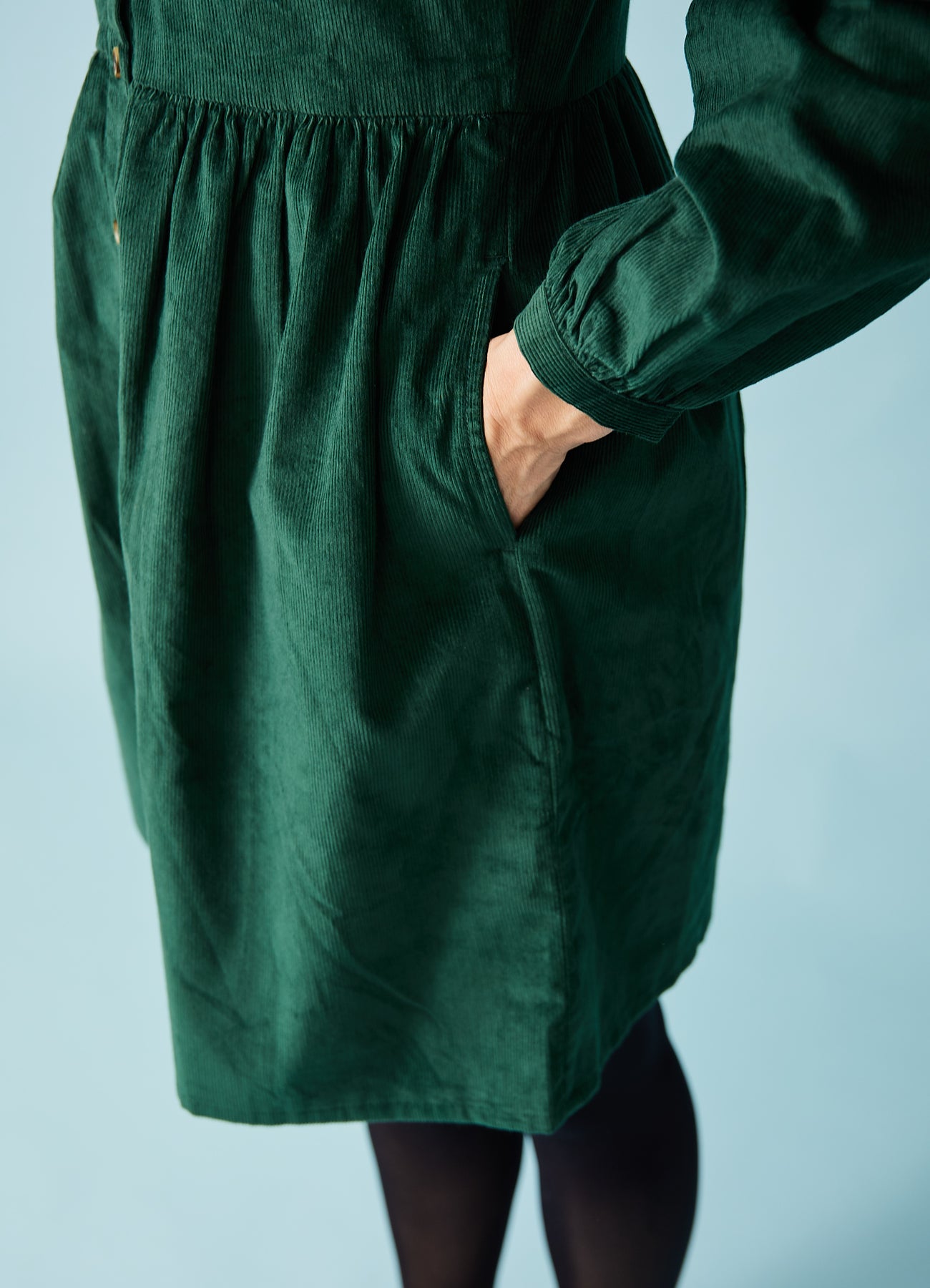 Den hyggeligste efterårskjole i mørkegrøn babyfløjl. Kort længde, som er perfekt sammen et par tykke strømpebukser.