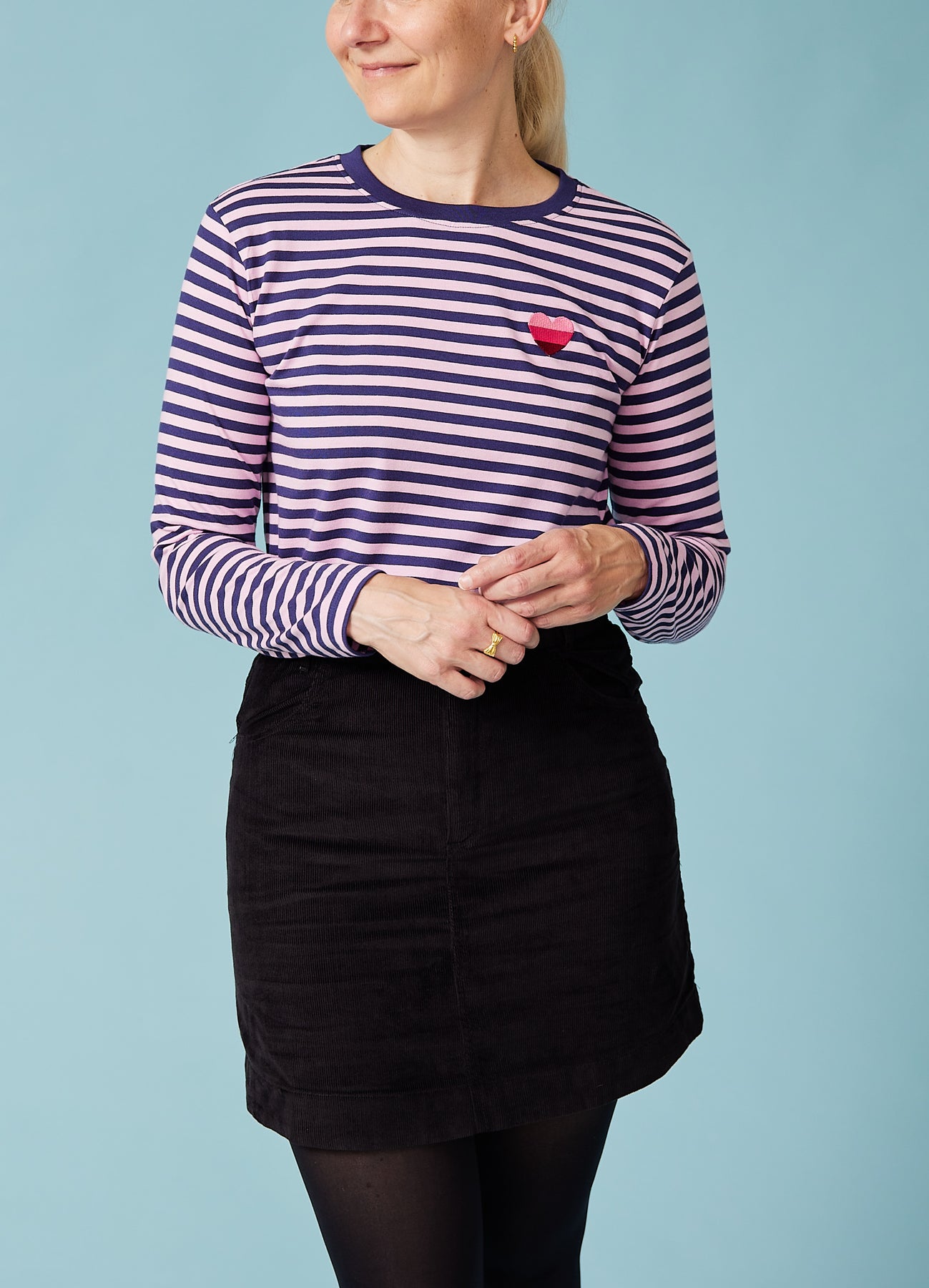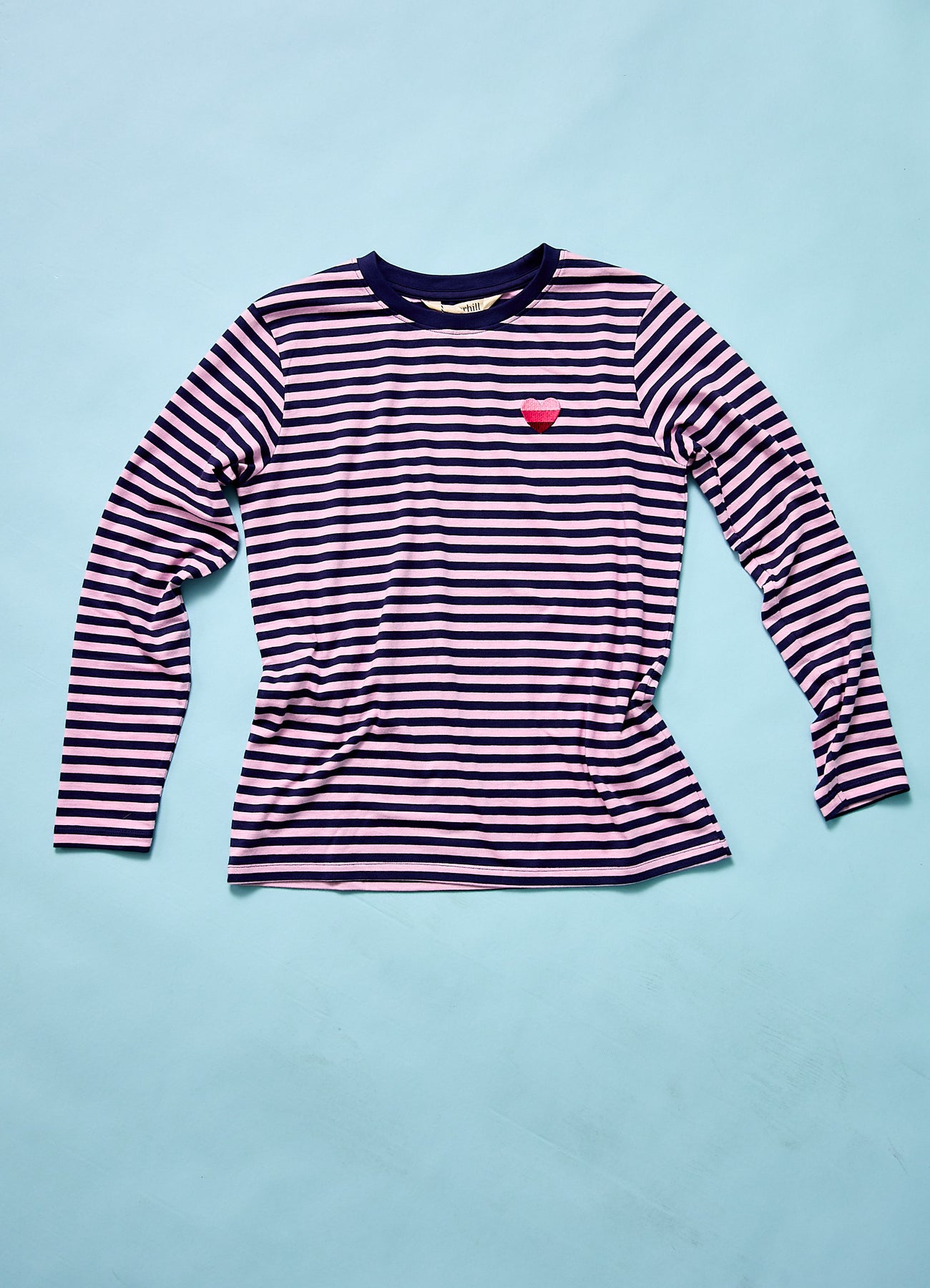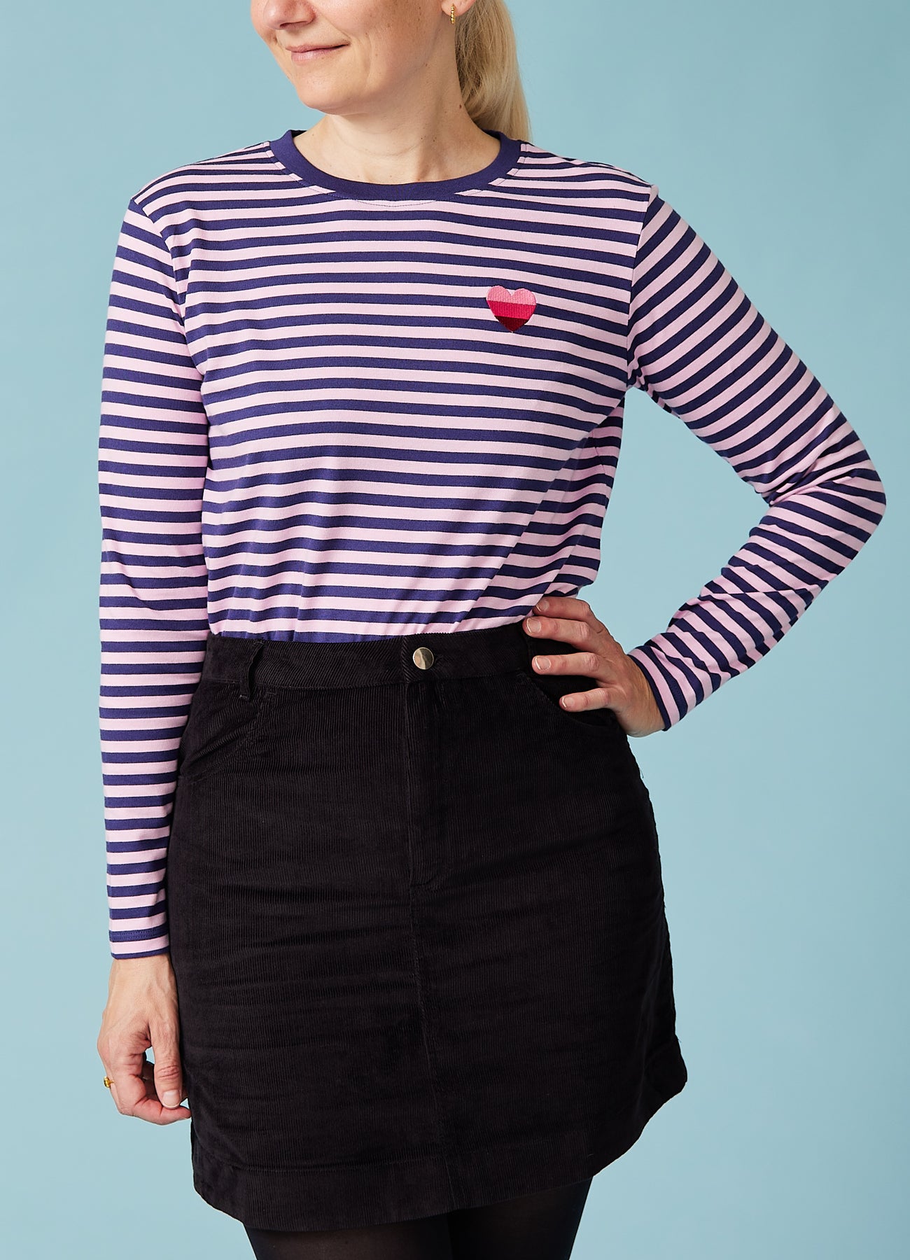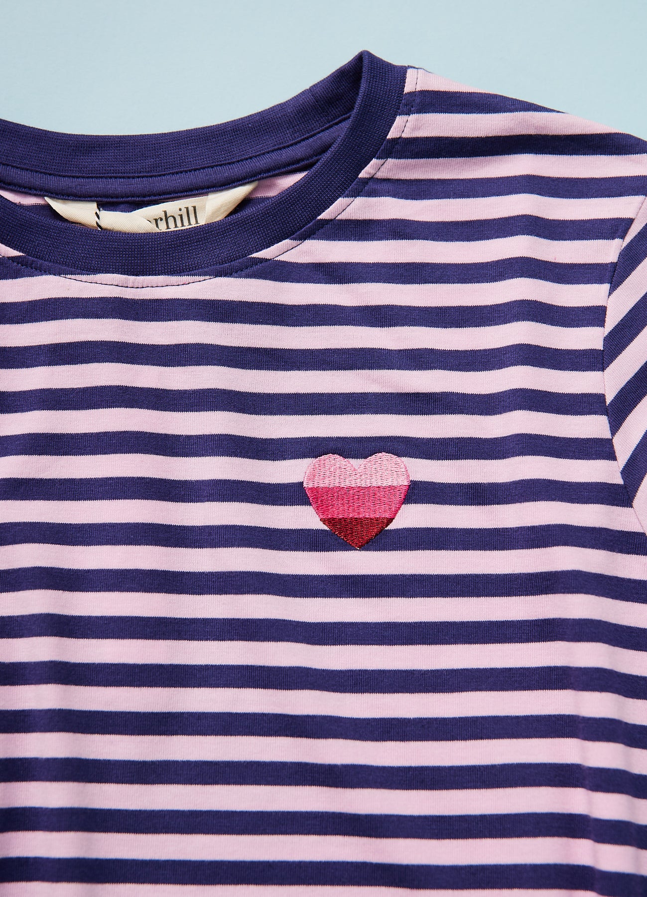 Klassisk stribet trøje med blå/lilla striber og fint lille hjerte-broderi på brystet.
