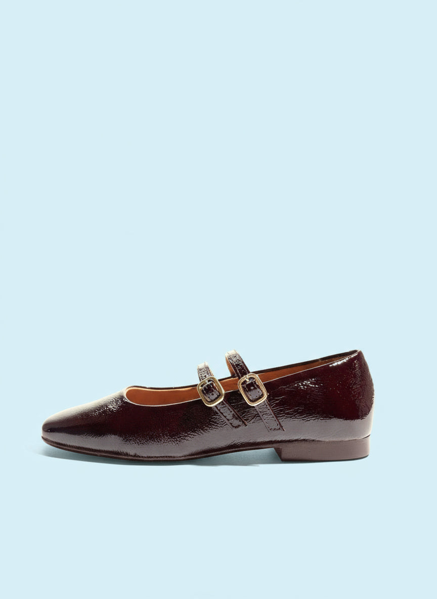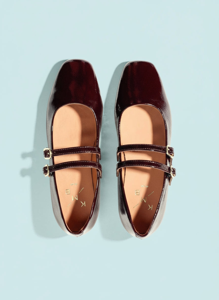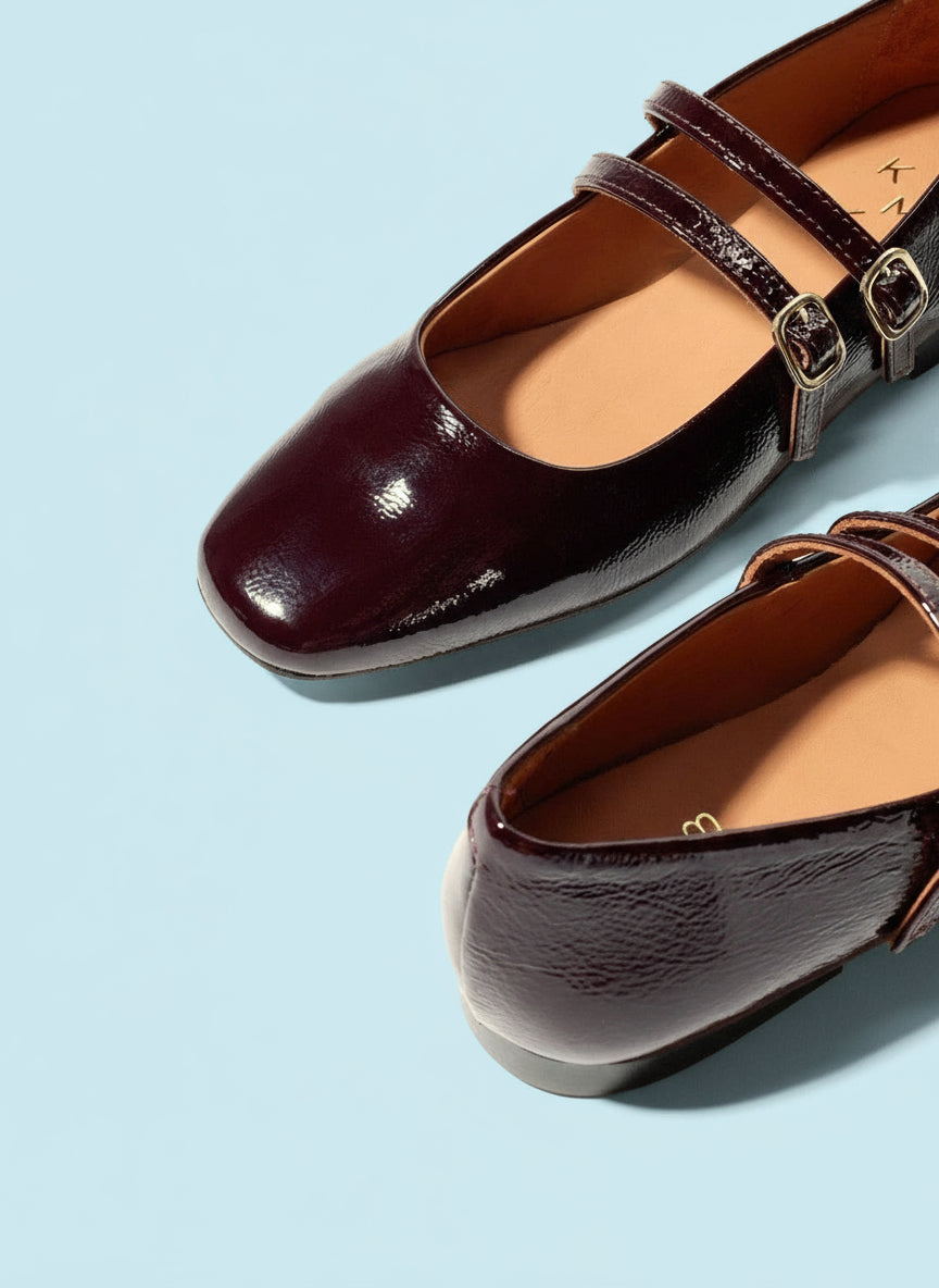 Smukke, flade laksko med "ballet-snude" og to remme over vristen. Lavet i lakeret læder med en dyb, mørkerød farve.