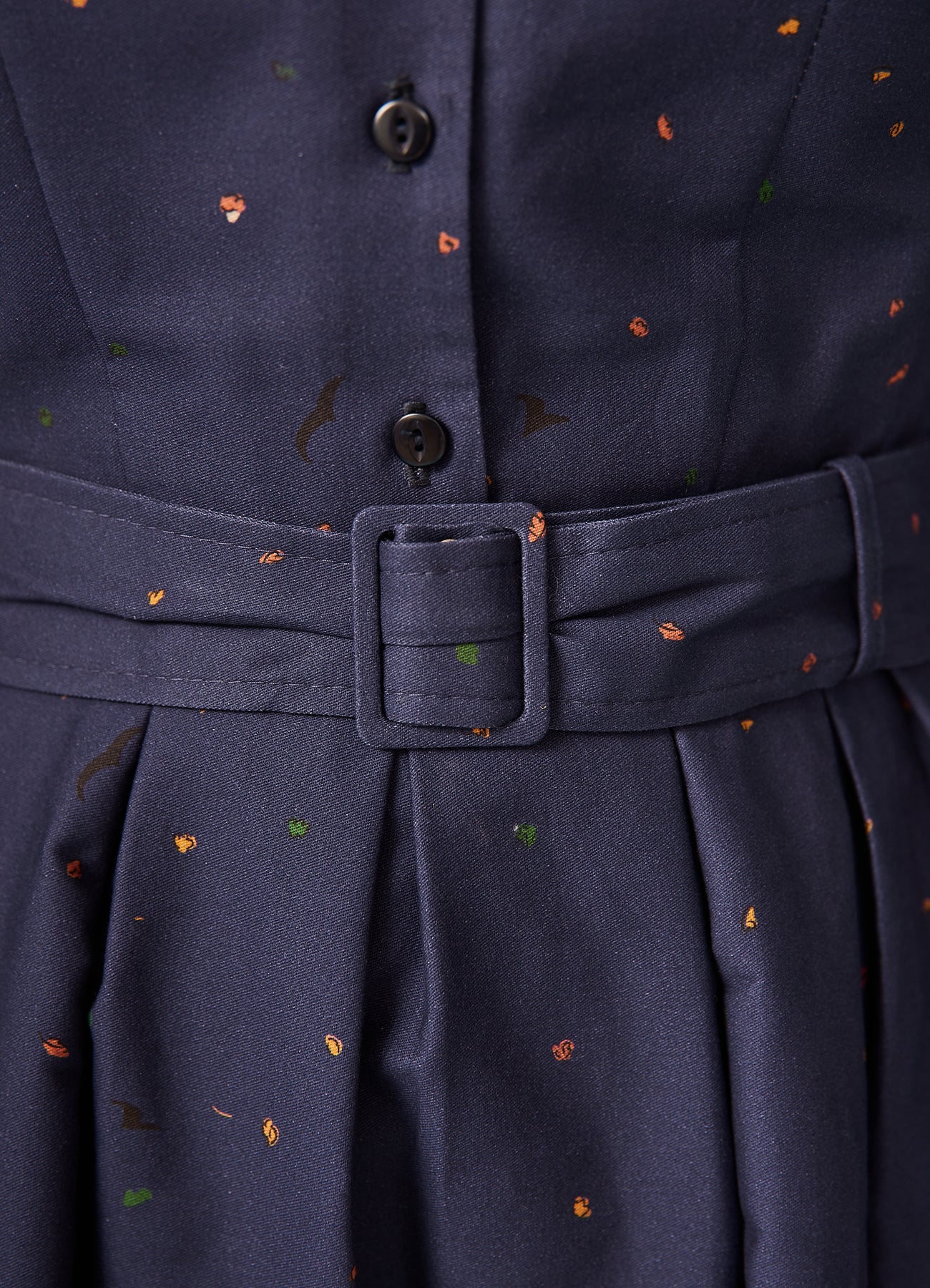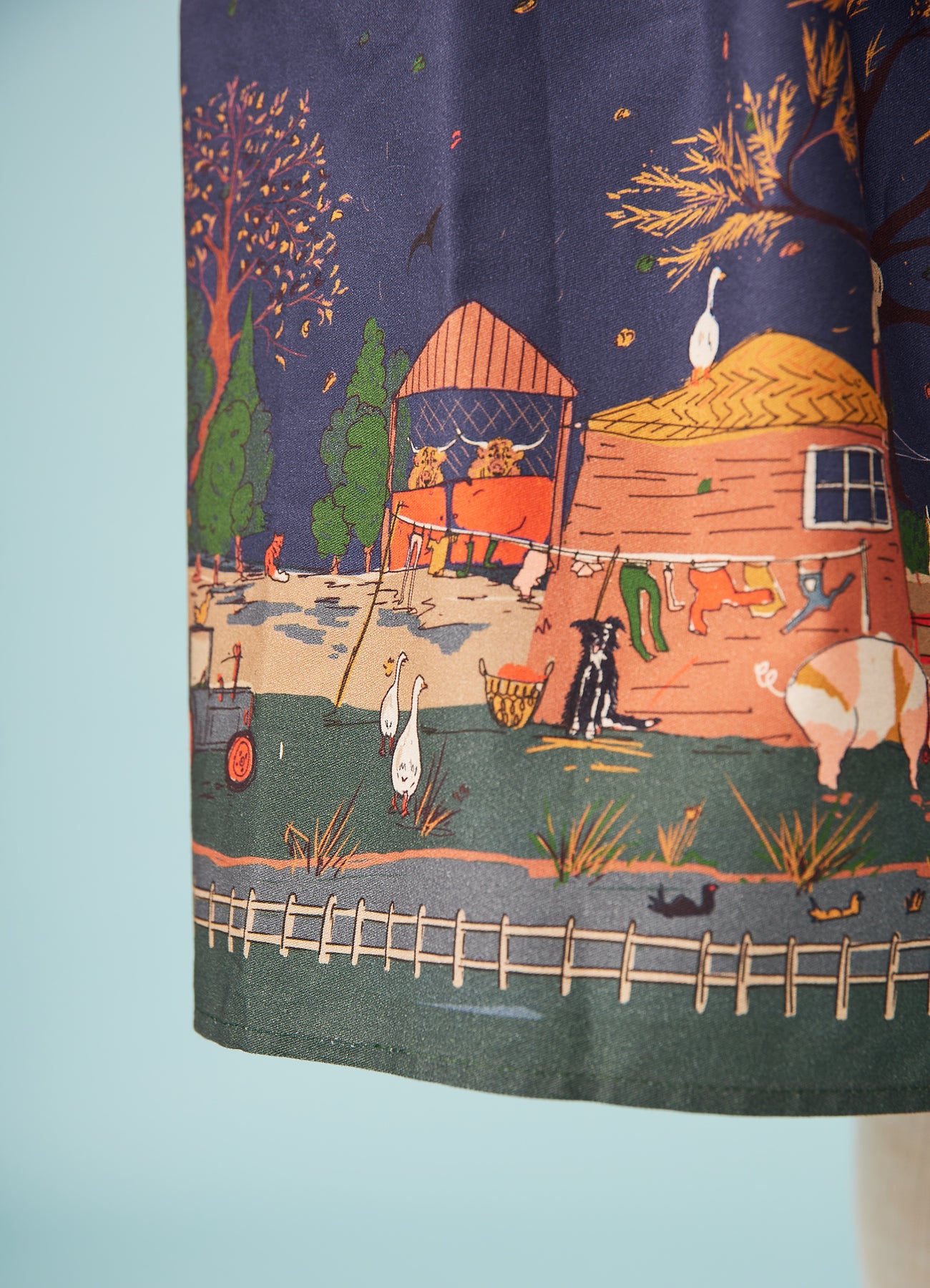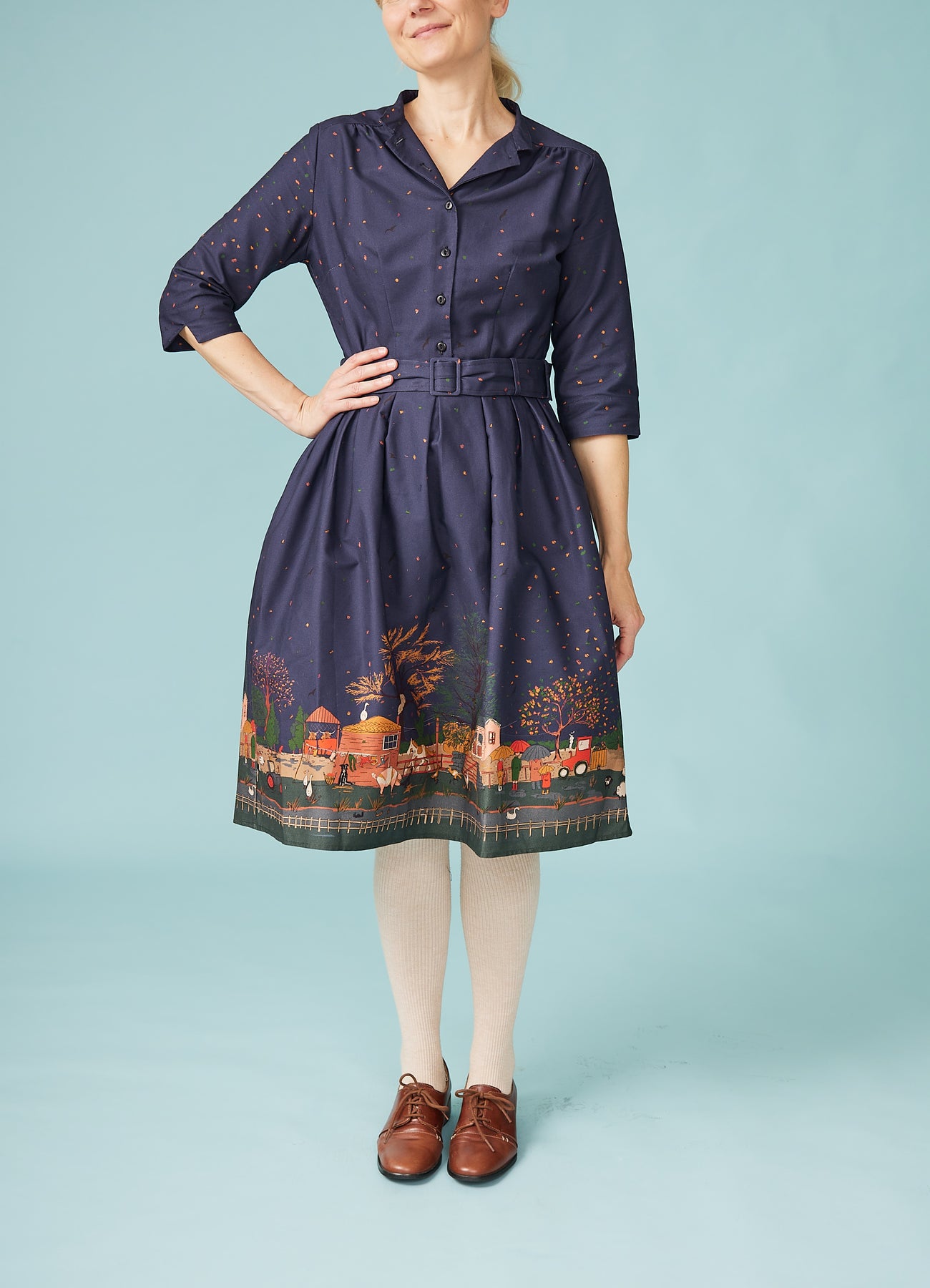 Et klassisk kjole-kunstværk fra britiske Palava! Nederst er kjolen dekoreret med et hyggeligt bondegårds-sceneri. På øverste del af kjolen er små, brune blade spredt over den mørkeblå efterårshimmel. Mønsteret er håndtegnet af Palavas egne designere, og kjolerne er fremstillet på deres egen systue i Storbritanien. Palavas mission er at lave tøj, som kan holde i flere generationer, og som er fremstillet på en fair og bæredygtig måde. Kjolen er 100% økologisk bomuld i en kraftig kvalitet med en lækker blød overflade.