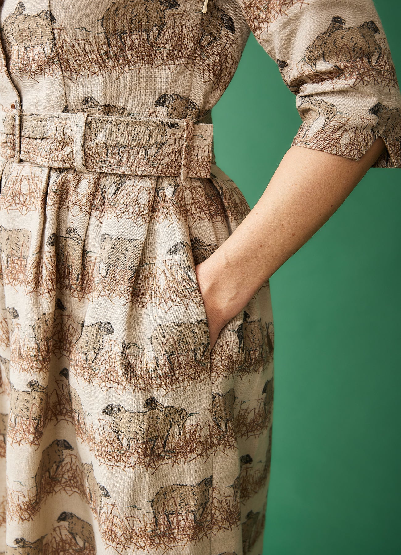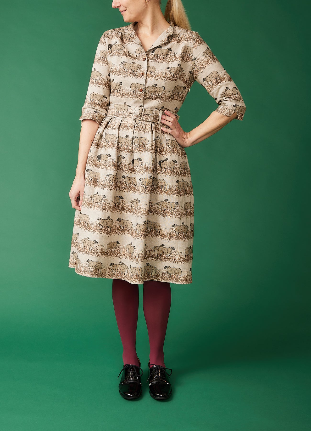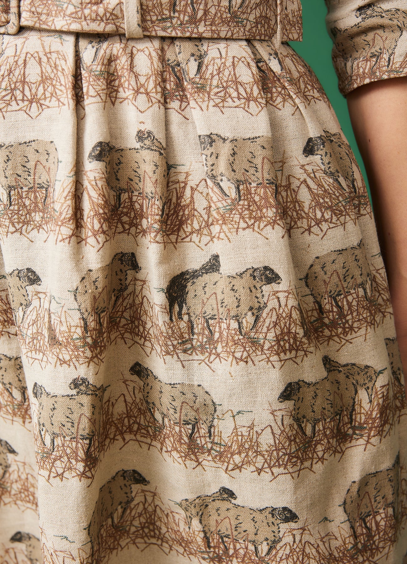 Den klassiske Cynthia-skjortekjole fra Palava med et hyggeligt, håndtegnet mønster af søde får - der har endda sneget sig et par sorte får med ind i mellem. Denne kjole er lavet i et meget begrænset antal! Stoffet er trykt i Palavas eget studio og kjolerne er syet på deres egen fabrik i London. Palavas mission er at lave tøj, som kan holde i flere generationer, og som er fremstillet på en fair og bæredygtig måde. Denne kjolen er lavet i en lækker blanding af hør og bomuld i en kraftig kvalitet med masser af struktur.