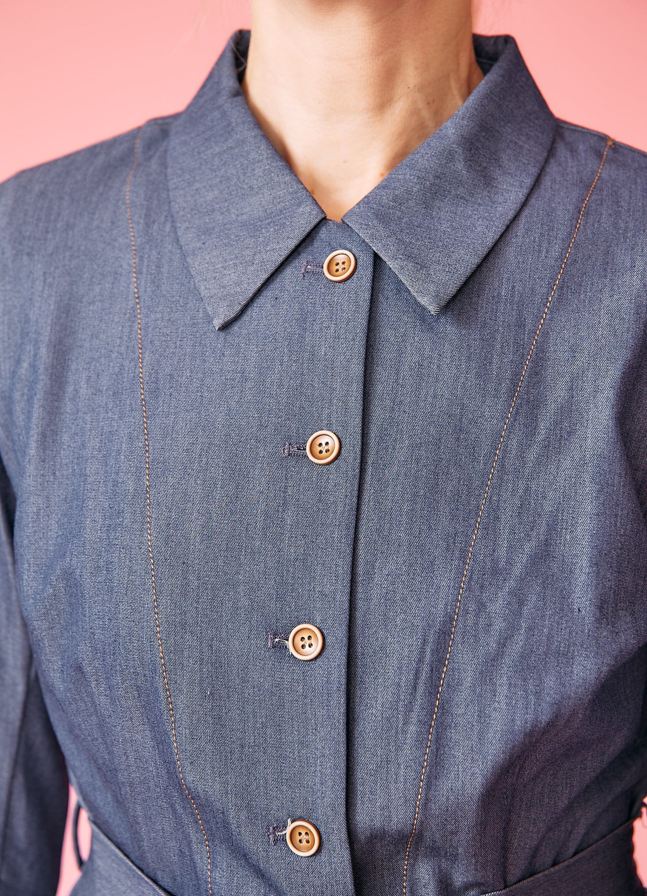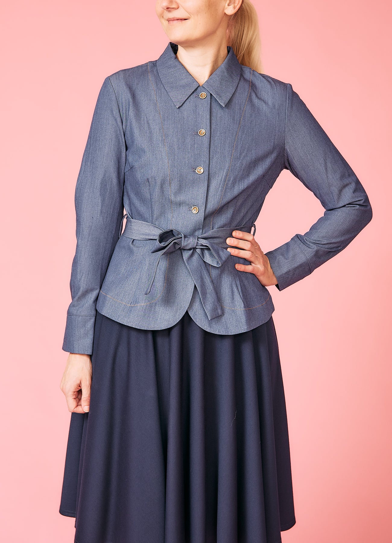 Superfin skjorte-jakke, som kan anvendes som både skjorte, blazer eller let jakke. Jakken er figursyet med vidde forneden og bindebånd i taljen, hvilket skaber et virkelig fin silhouet i 1940'er-stil.