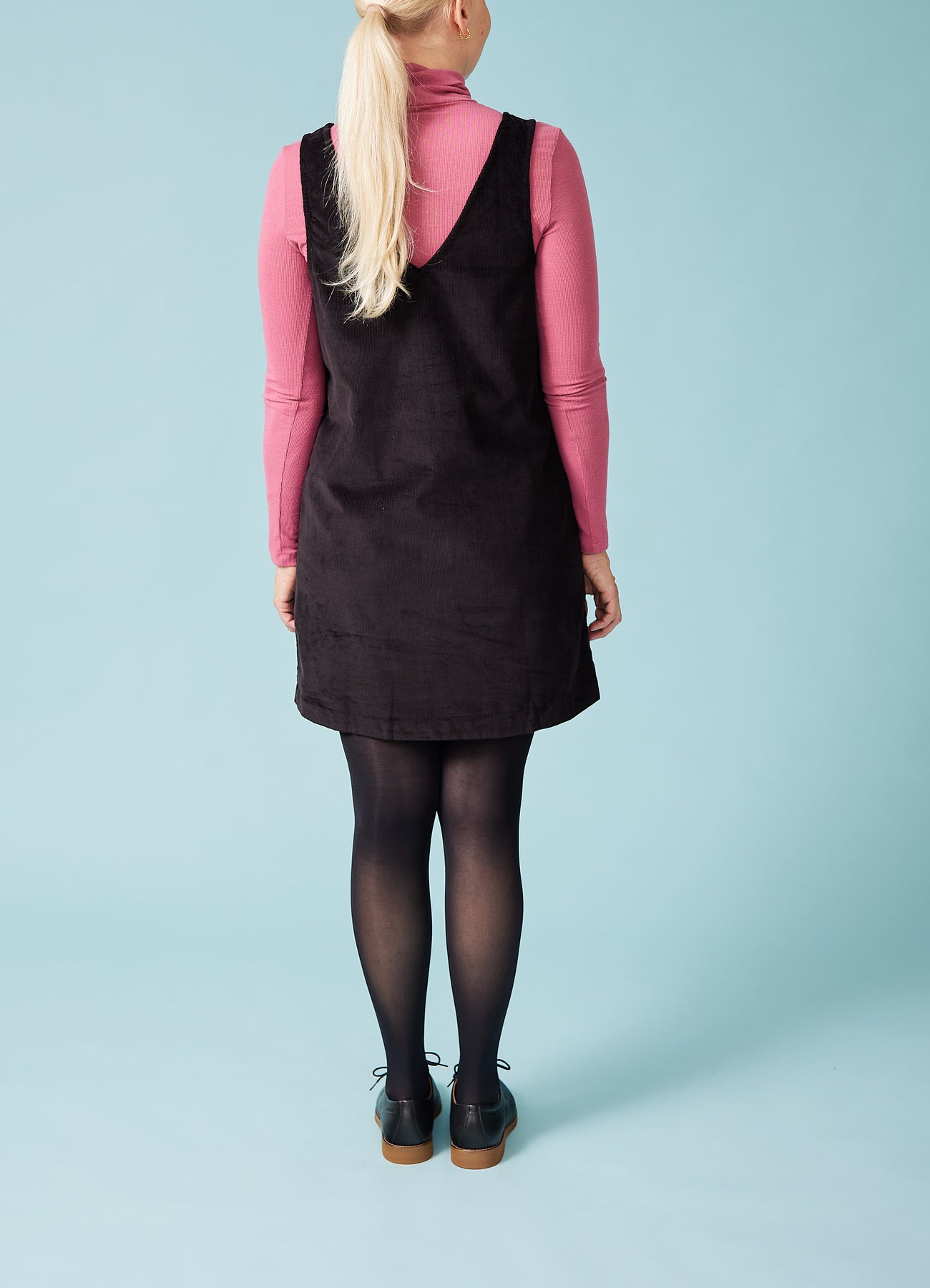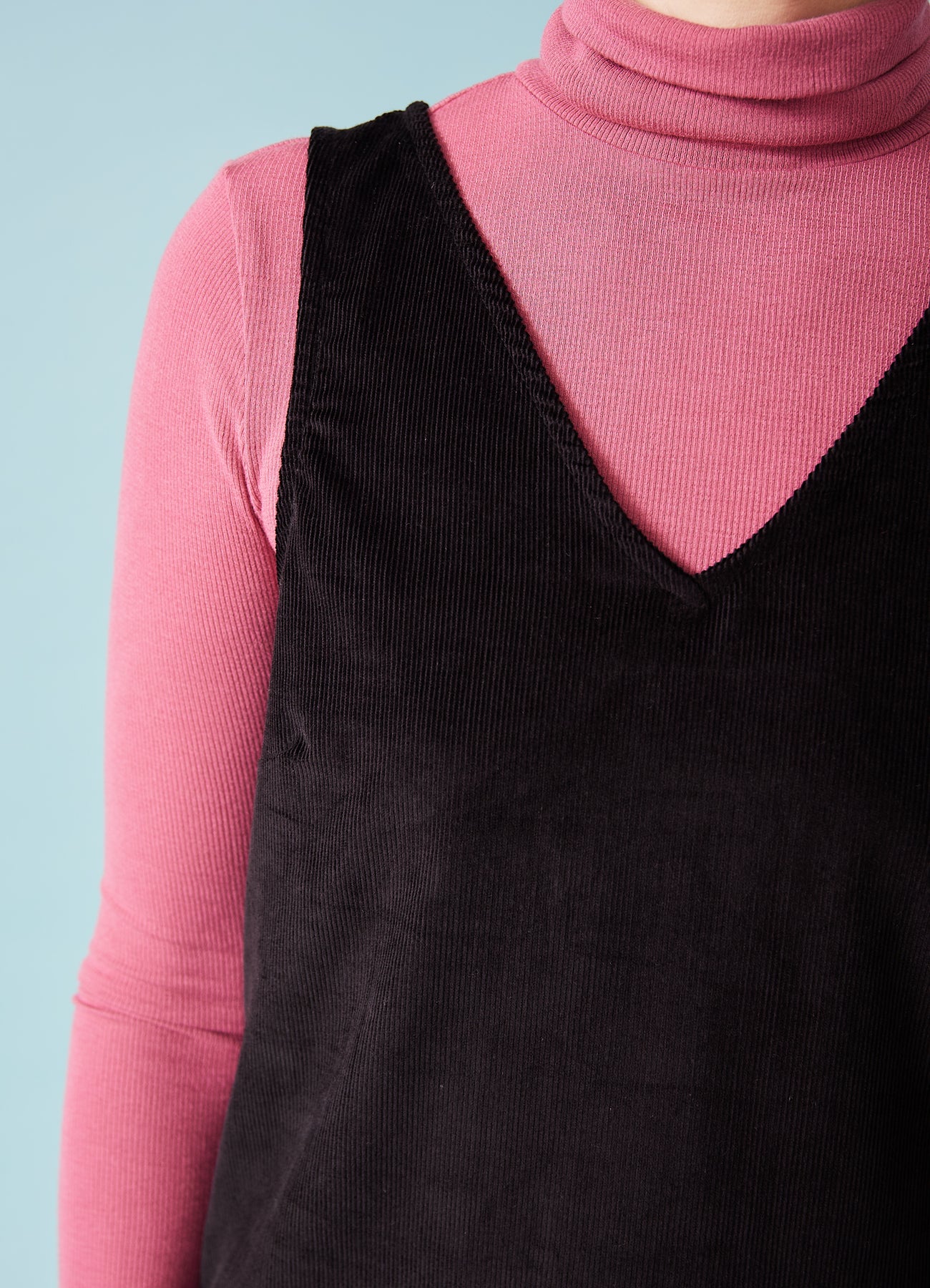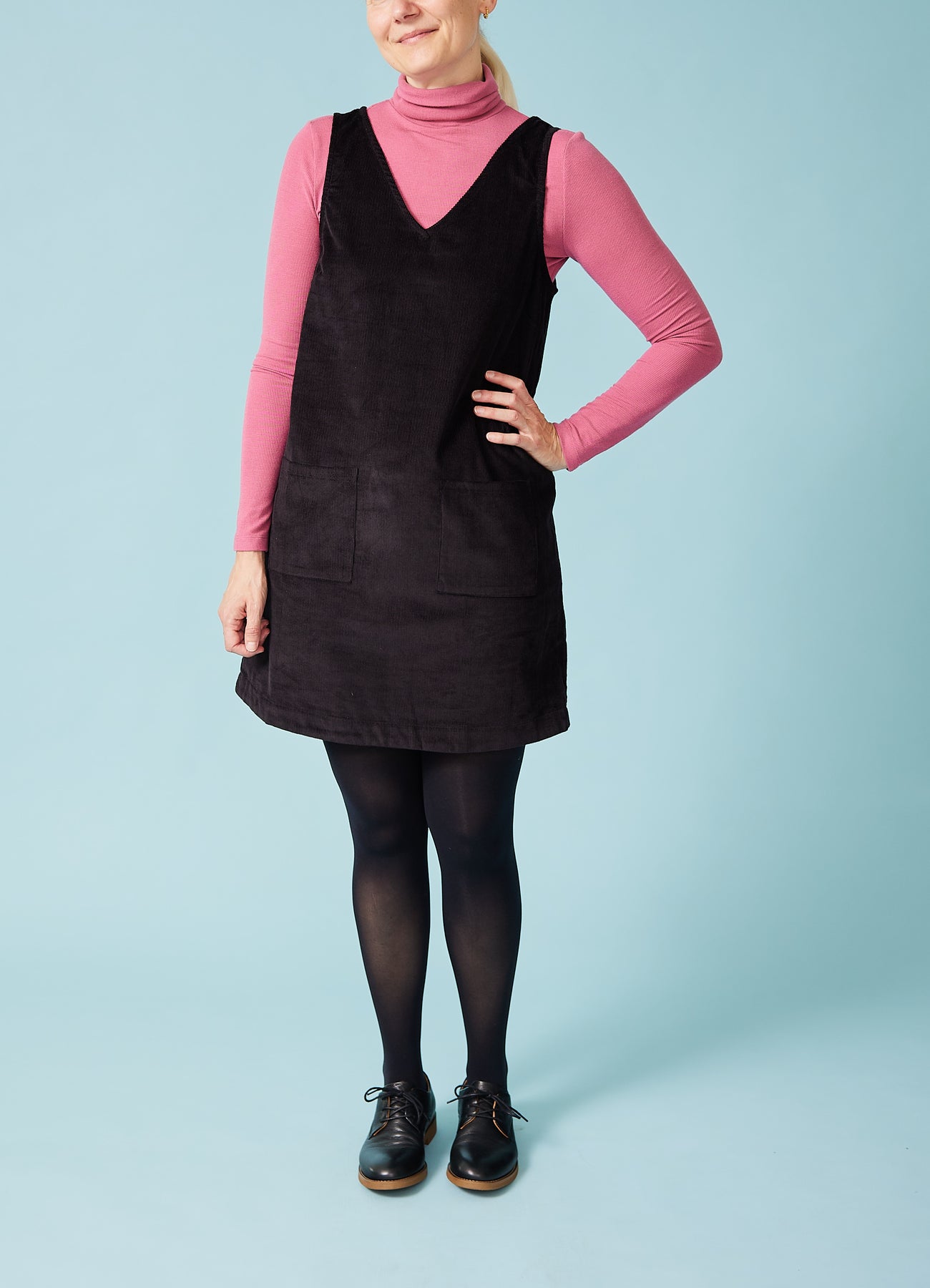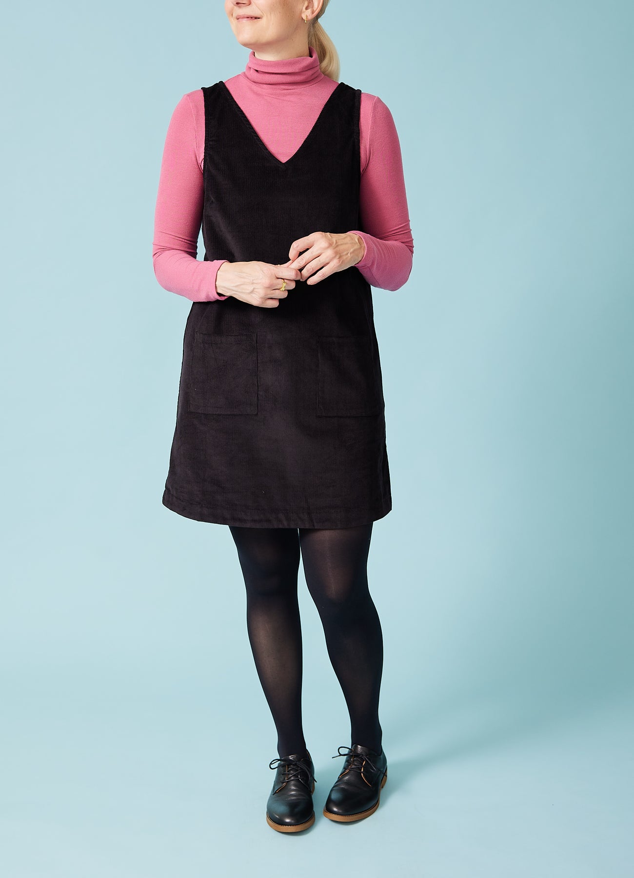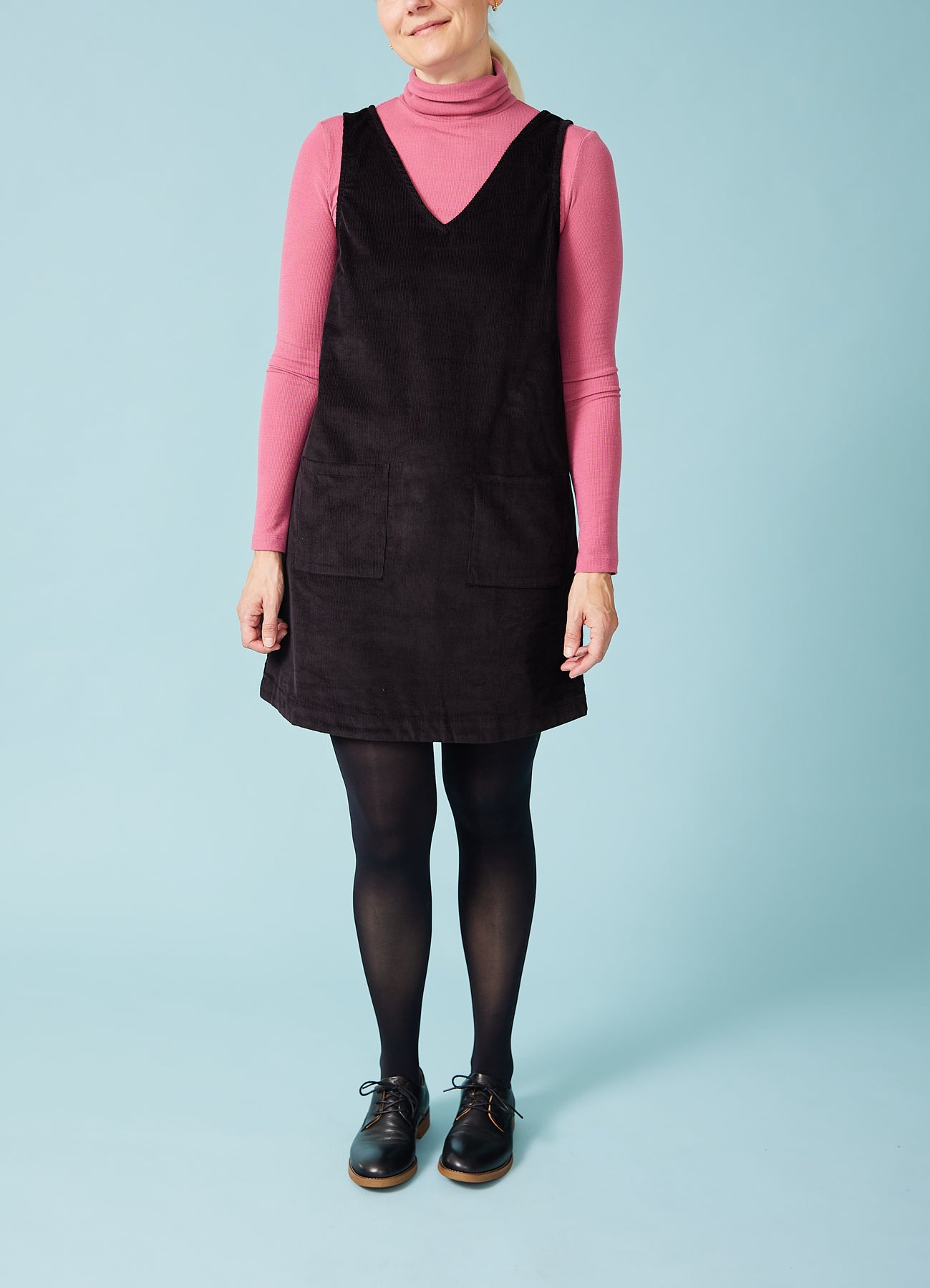Fin, enkel spencer-kjole i babyfløjl med v-hals og påsyede lommer foran. Fantastisk til efterårets basisgarderobe.