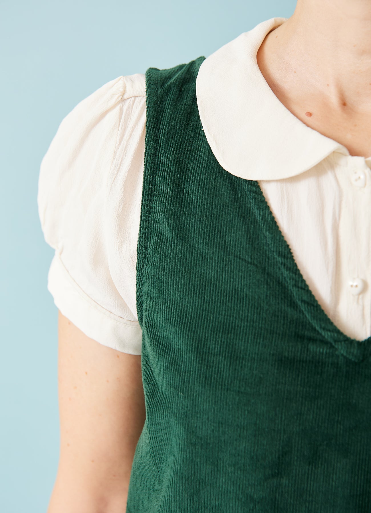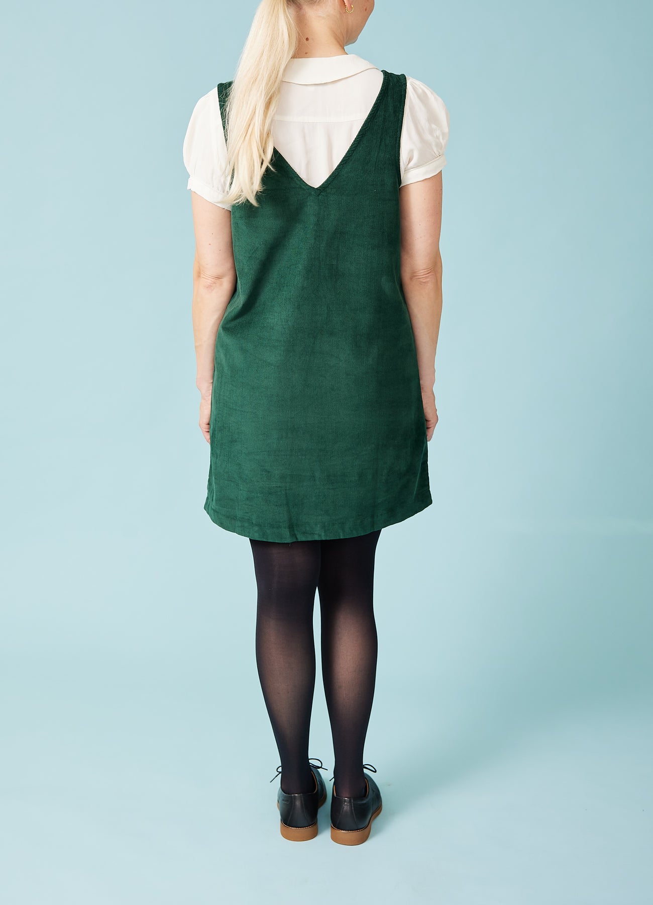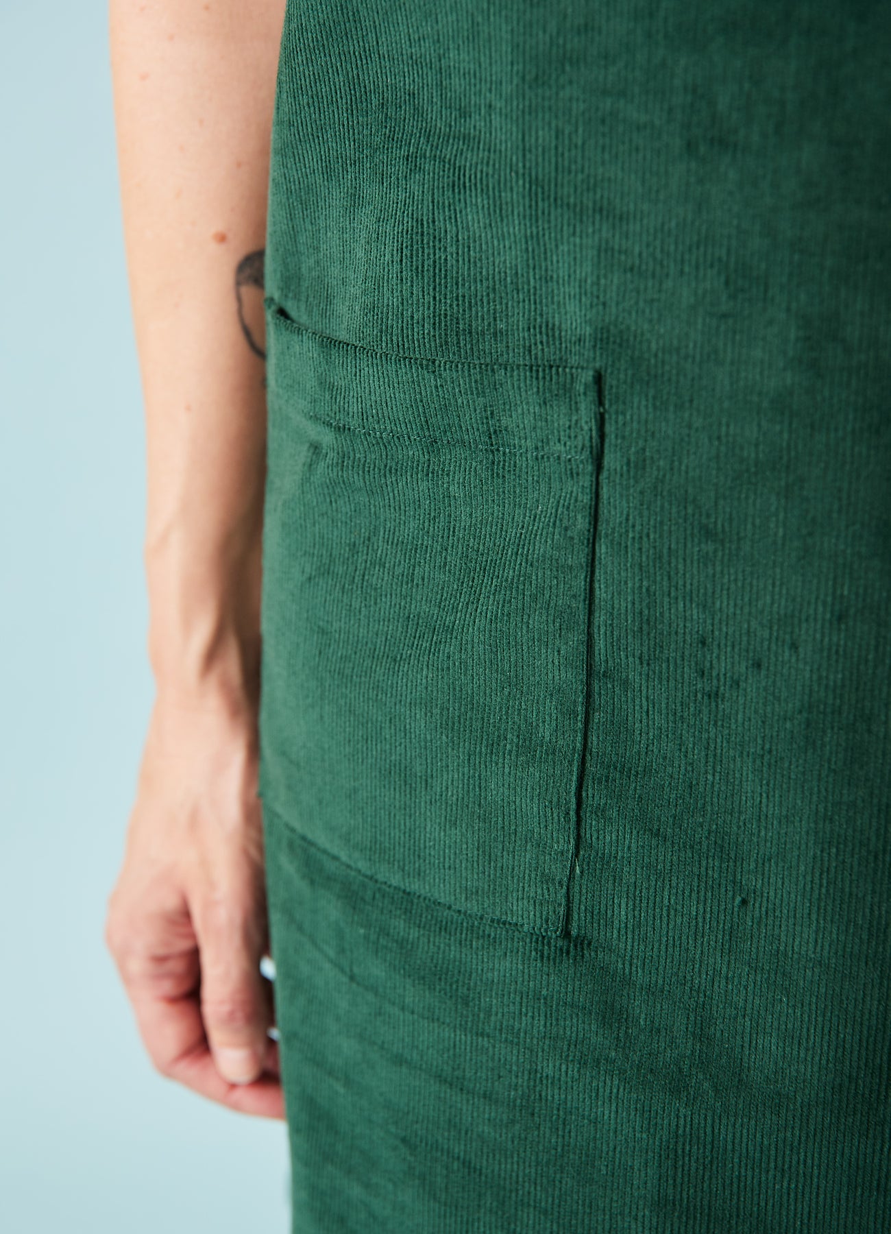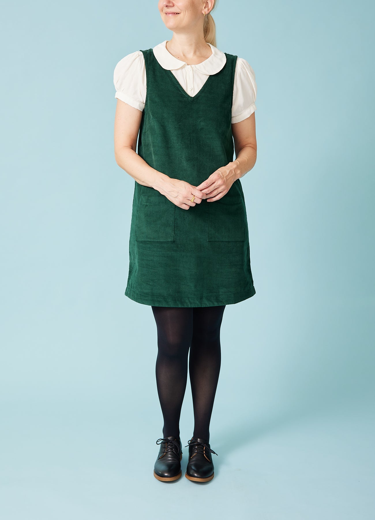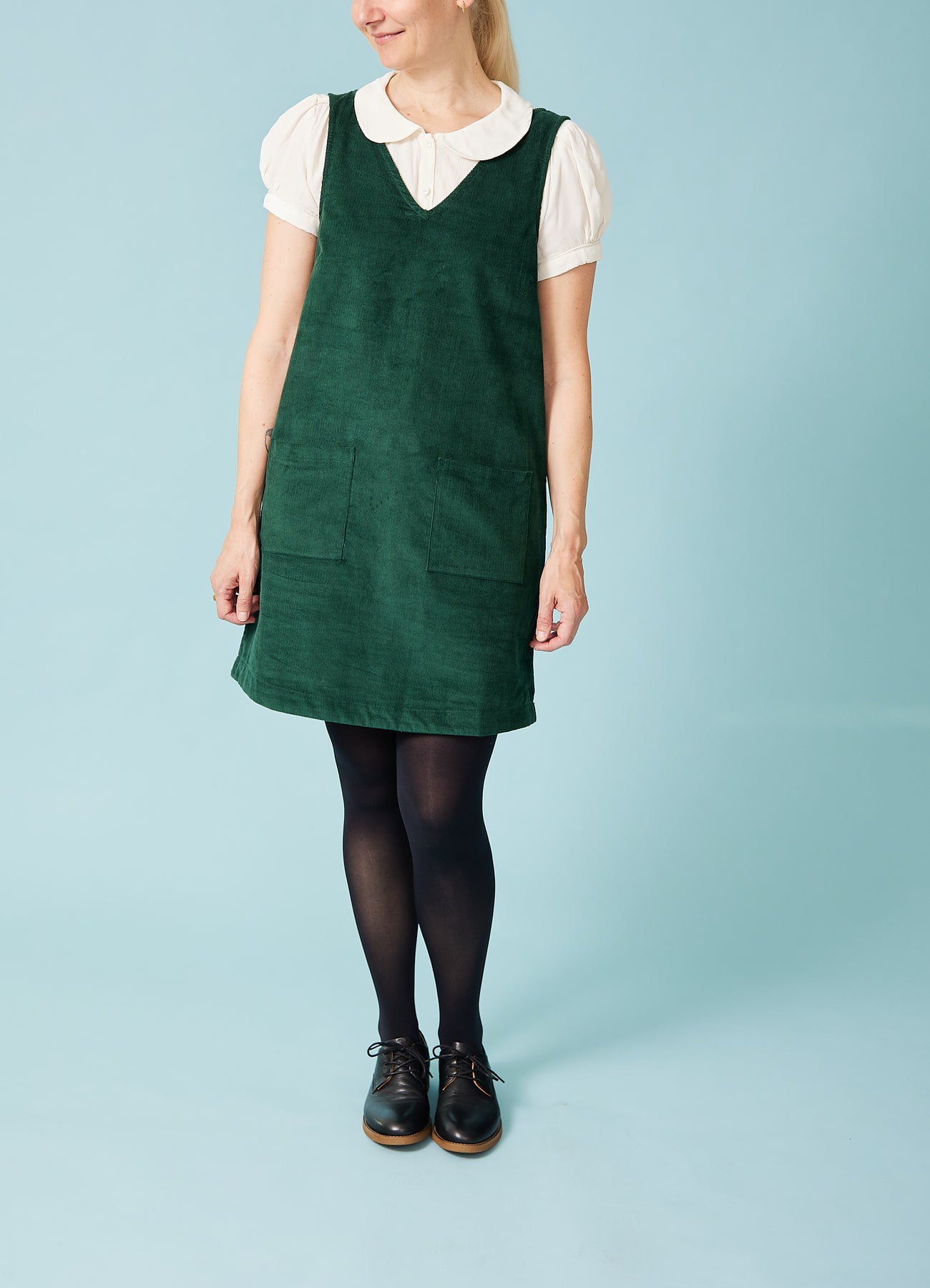 Fin, enkel spencer-kjole i babyfløjl med v-hals og påsyede lommer foran. Fantastisk til efterårets basisgarderobe.
