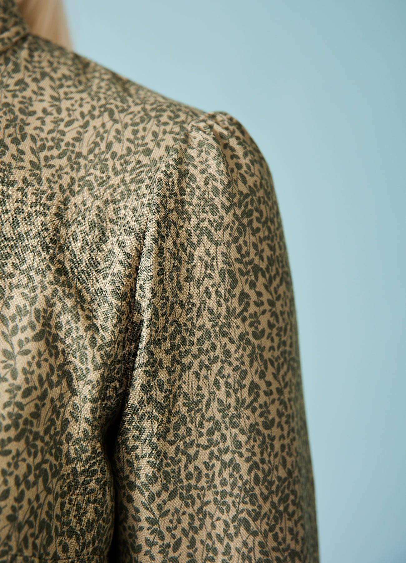 Smuk blomstret efterårskjole i grønne nuancer. Kjolen har bindebånd i halsen og aftageligt bindebånd i taljen. Den er lavet i silkeblød viskose, der falder virkelig smukt og føles vidunderlig at have på. Kjolen er produceret i EU.