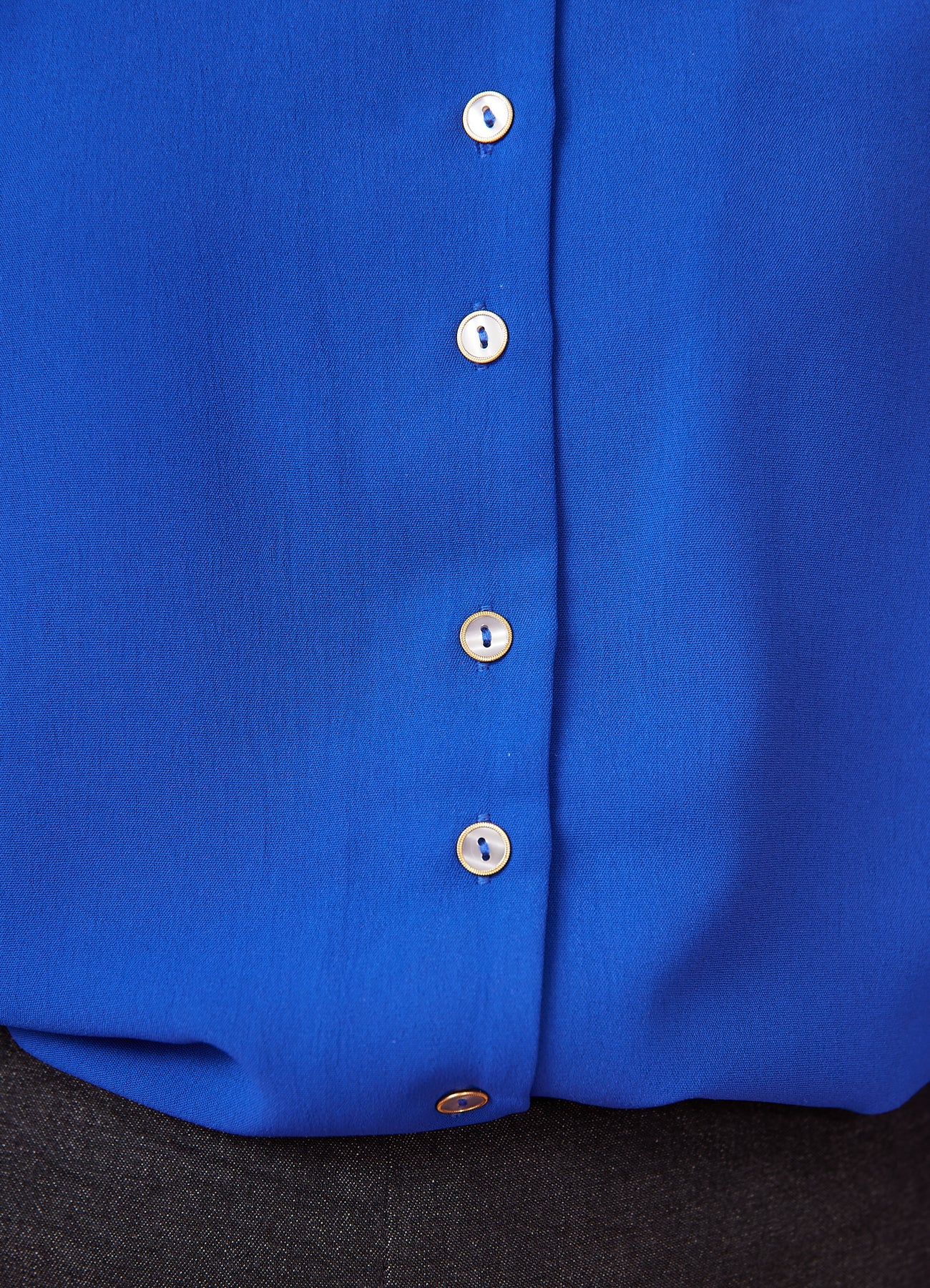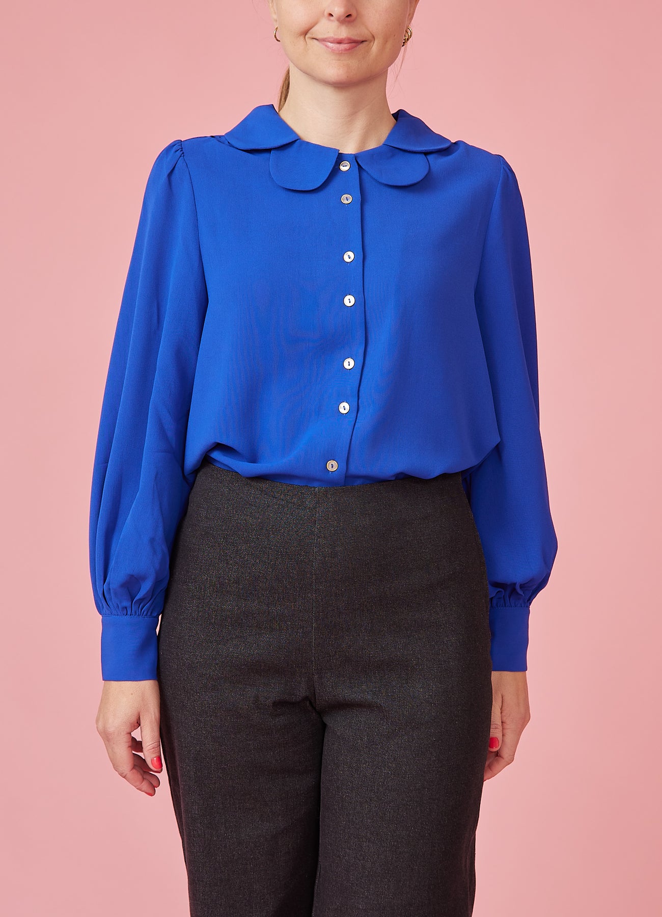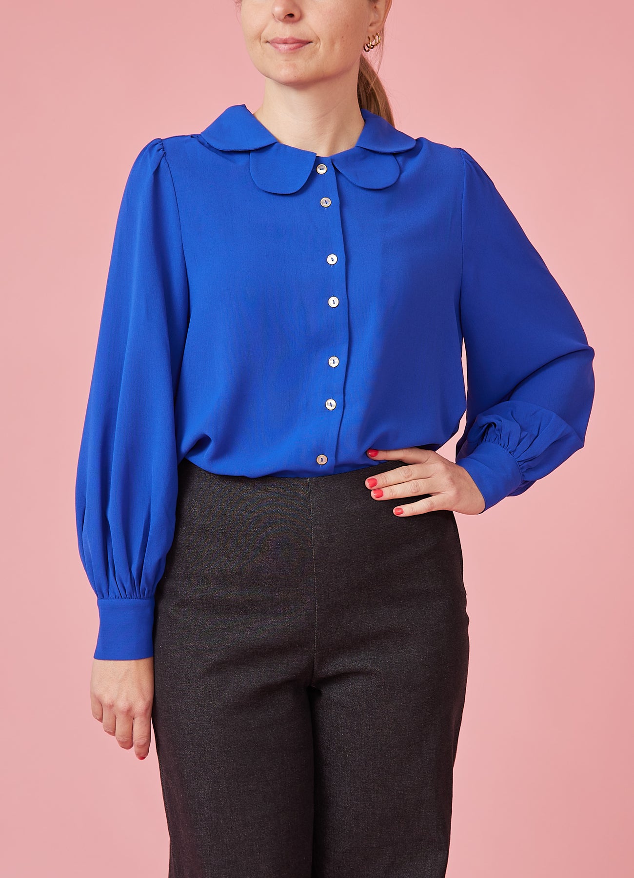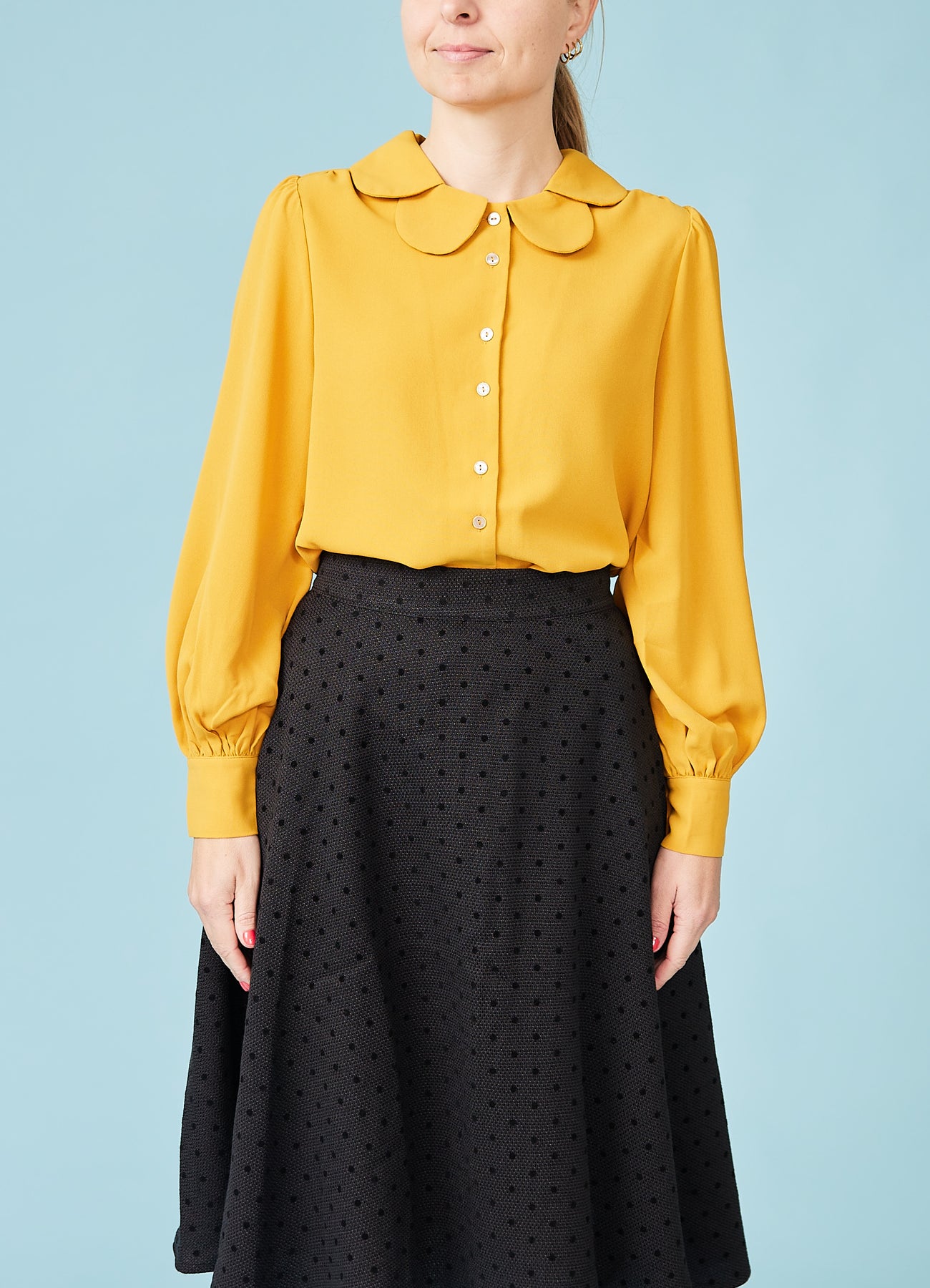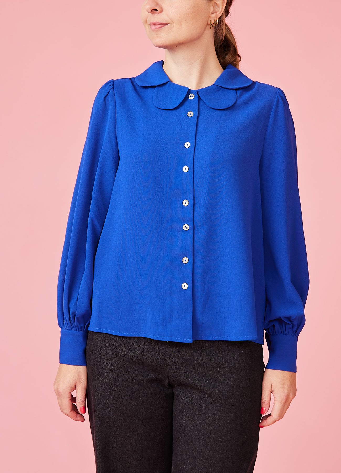 Smuk skjortebluse med den fineste to-delte krave, der ligner blomsterblade. Skjorten har fine ballonærmer og tætsiddende manchetter med dekoraktive knapper. Skjorten er lavet i 100% polyester i en meget lækker kvalitet, som ikke er statisk og føles som viskose.
