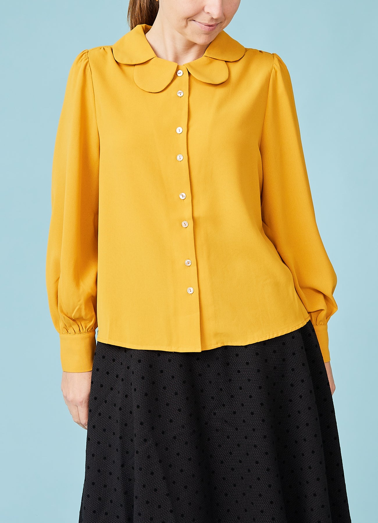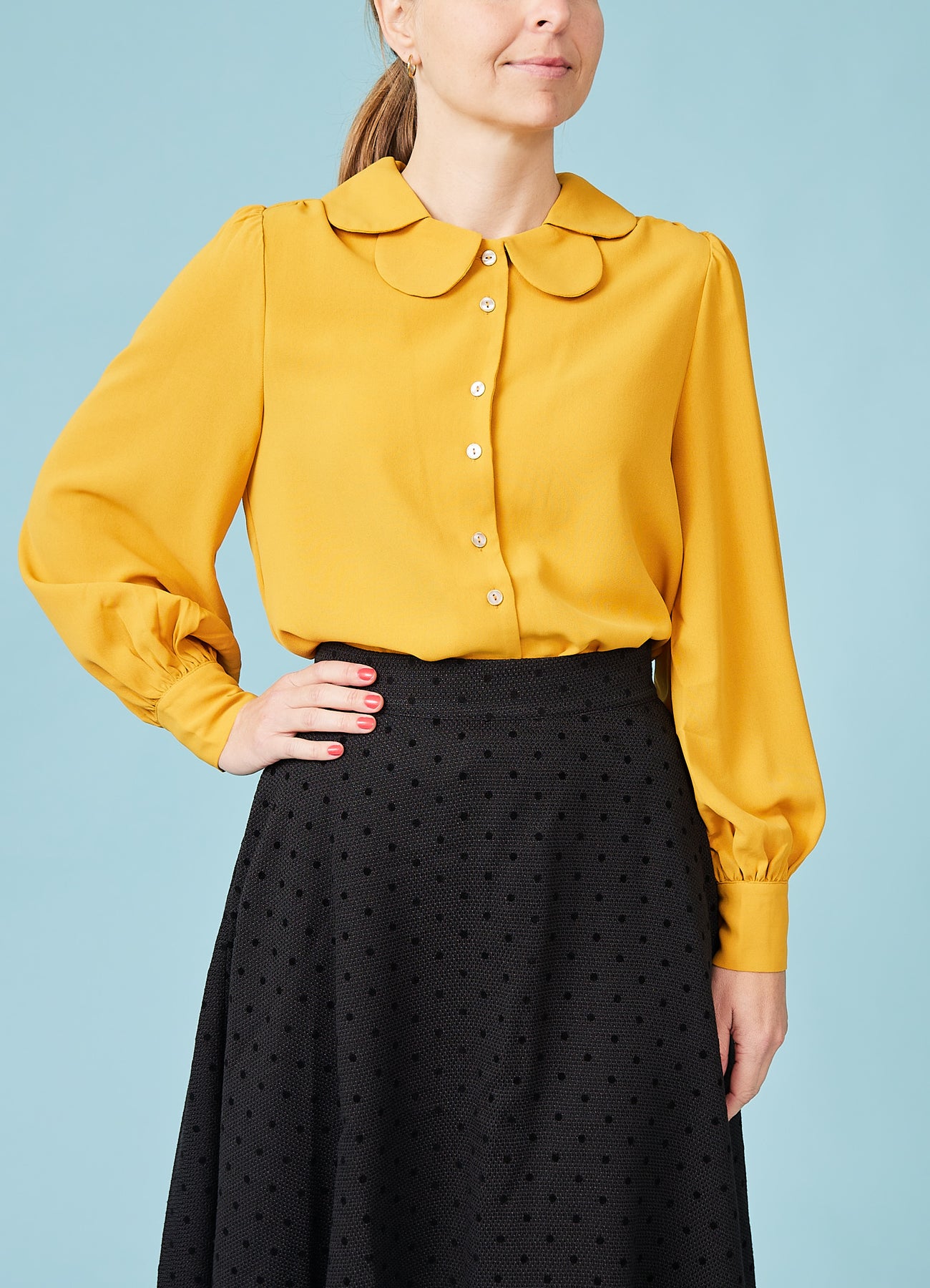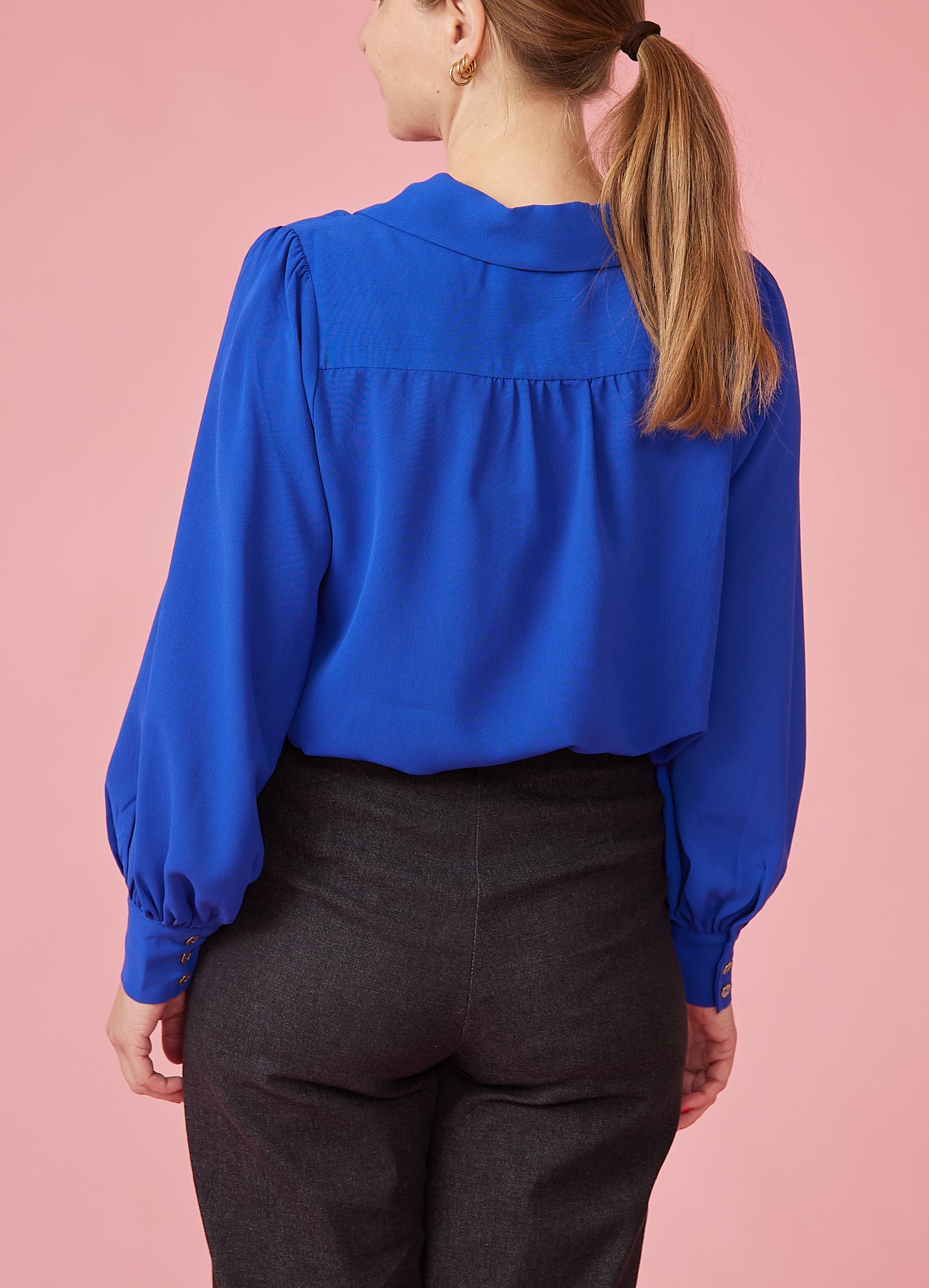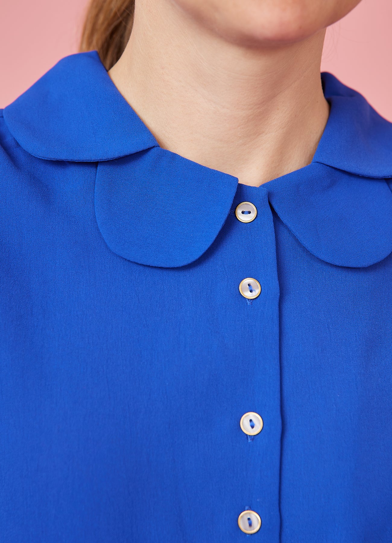 Smuk skjortebluse med den fineste to-delte krave, der ligner blomsterblade. Skjorten har fine ballonærmer og tætsiddende manchetter med dekoraktive knapper. Skjorten er lavet i 100% polyester i en meget lækker kvalitet, som ikke er statisk og føles som viskose.