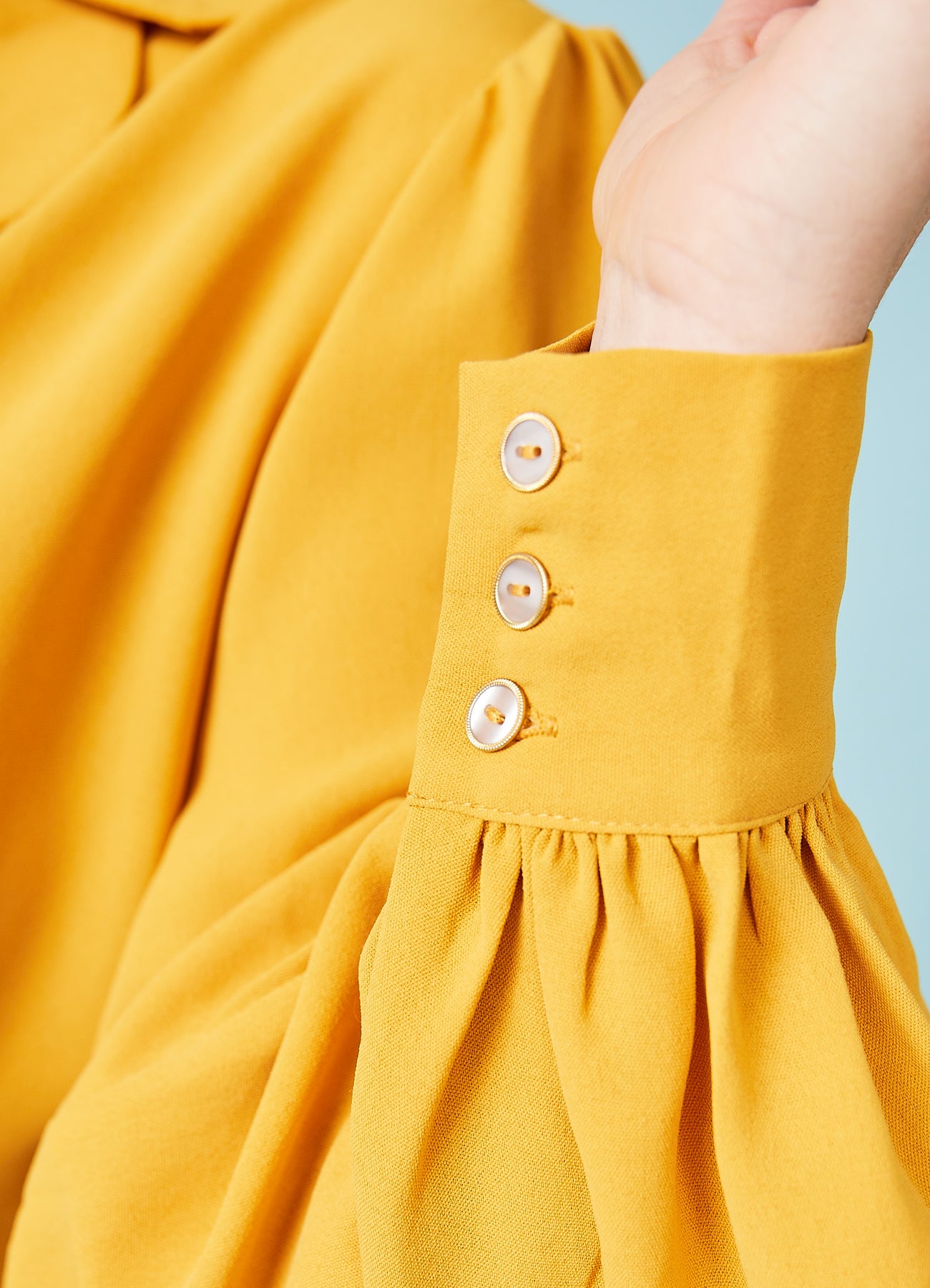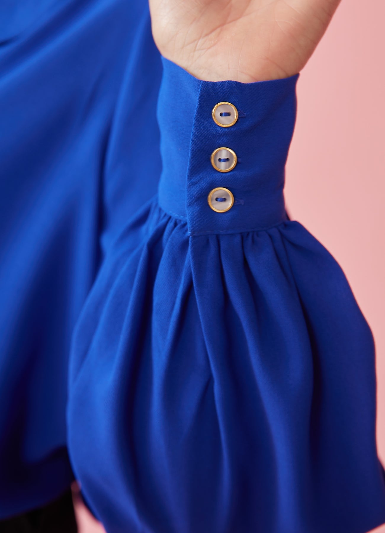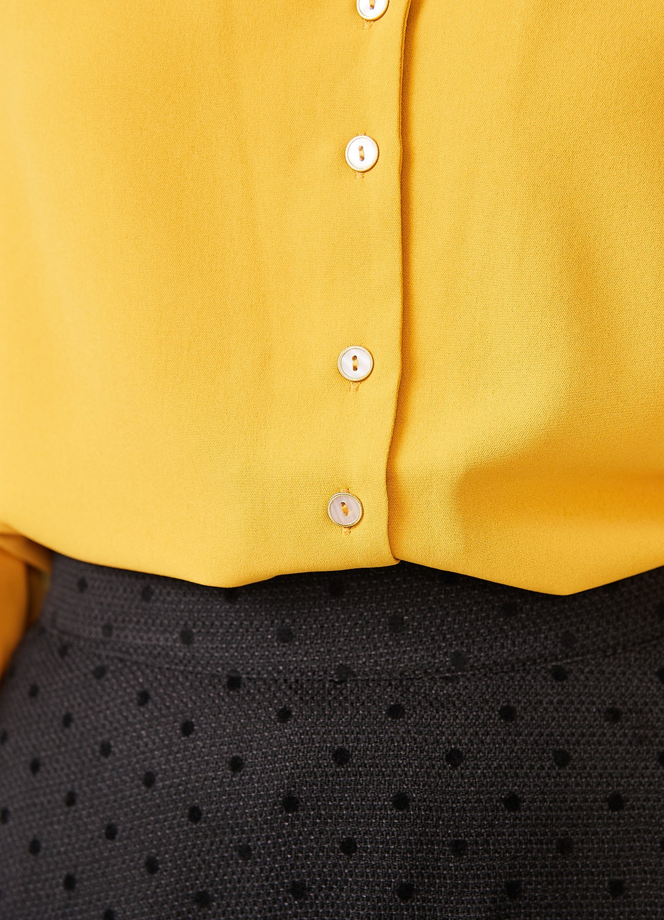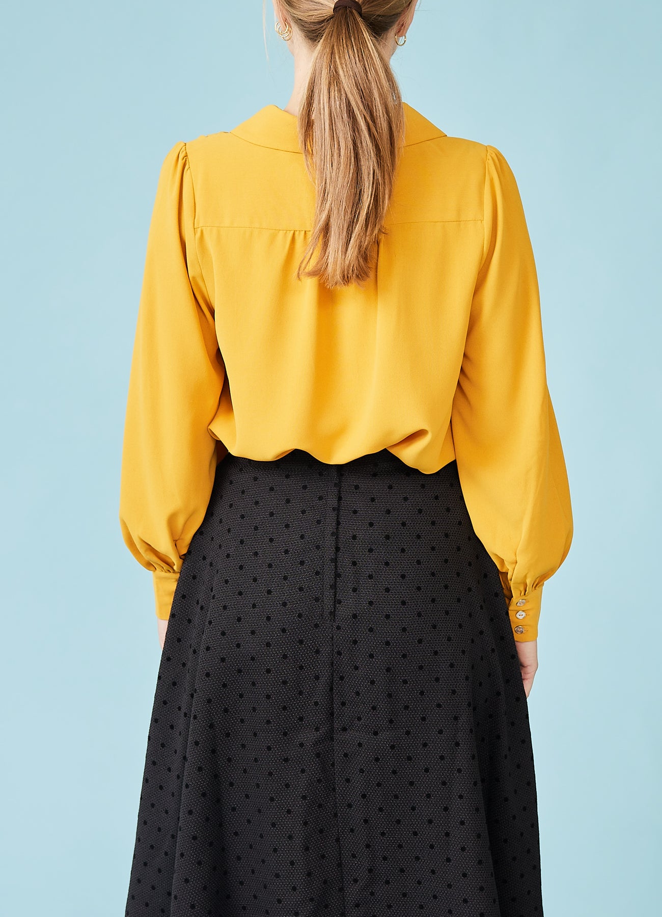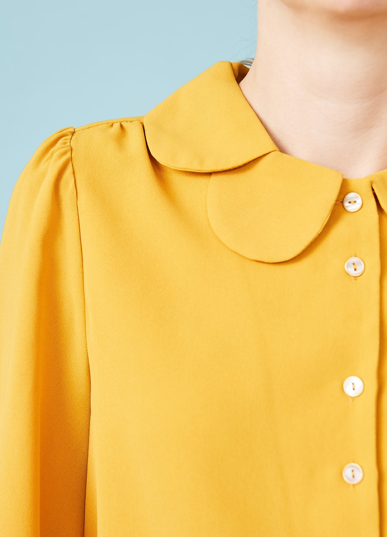 Smuk skjortebluse med den fineste to-delte krave, der ligner blomsterblade. Skjorten har fine ballonærmer og tætsiddende manchetter med dekoraktive knapper. Skjorten er lavet i 100% polyester i en meget lækker kvalitet, som ikke er statisk og føles som viskose.