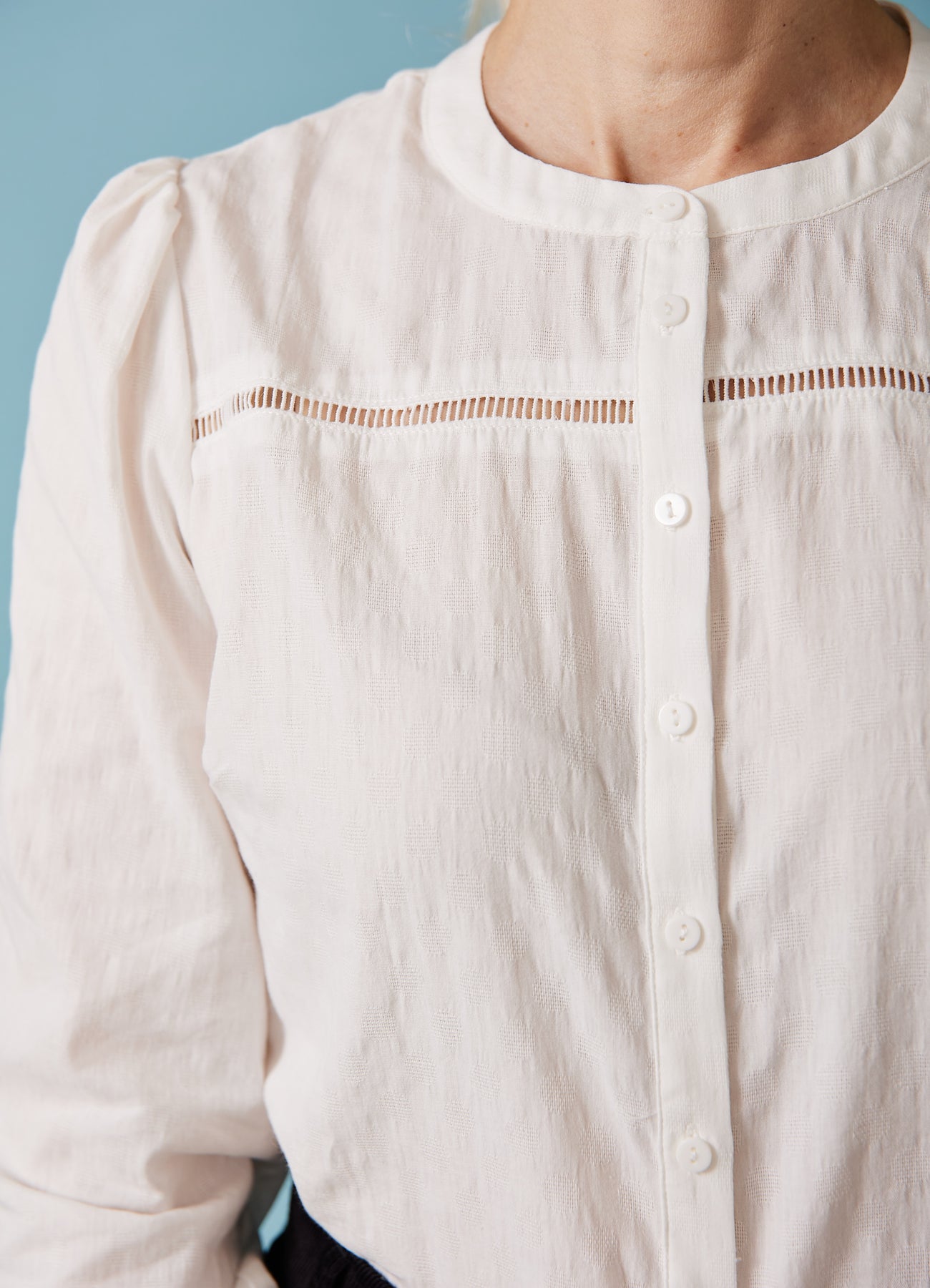 Cremefarvet skjortebluse uden krave med små blomsterbroderier nederst på ærmet. Det fine bomuldsstof er vævet med tone-i-tone-prikker og har et indsyet blondebånd, som skaber fine, gennemsigtige detaljer øverst på brystet og ned langs ærmet.