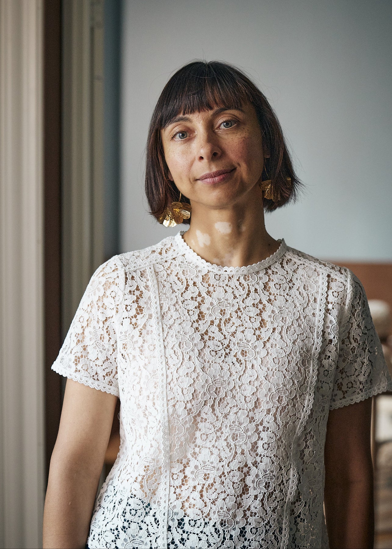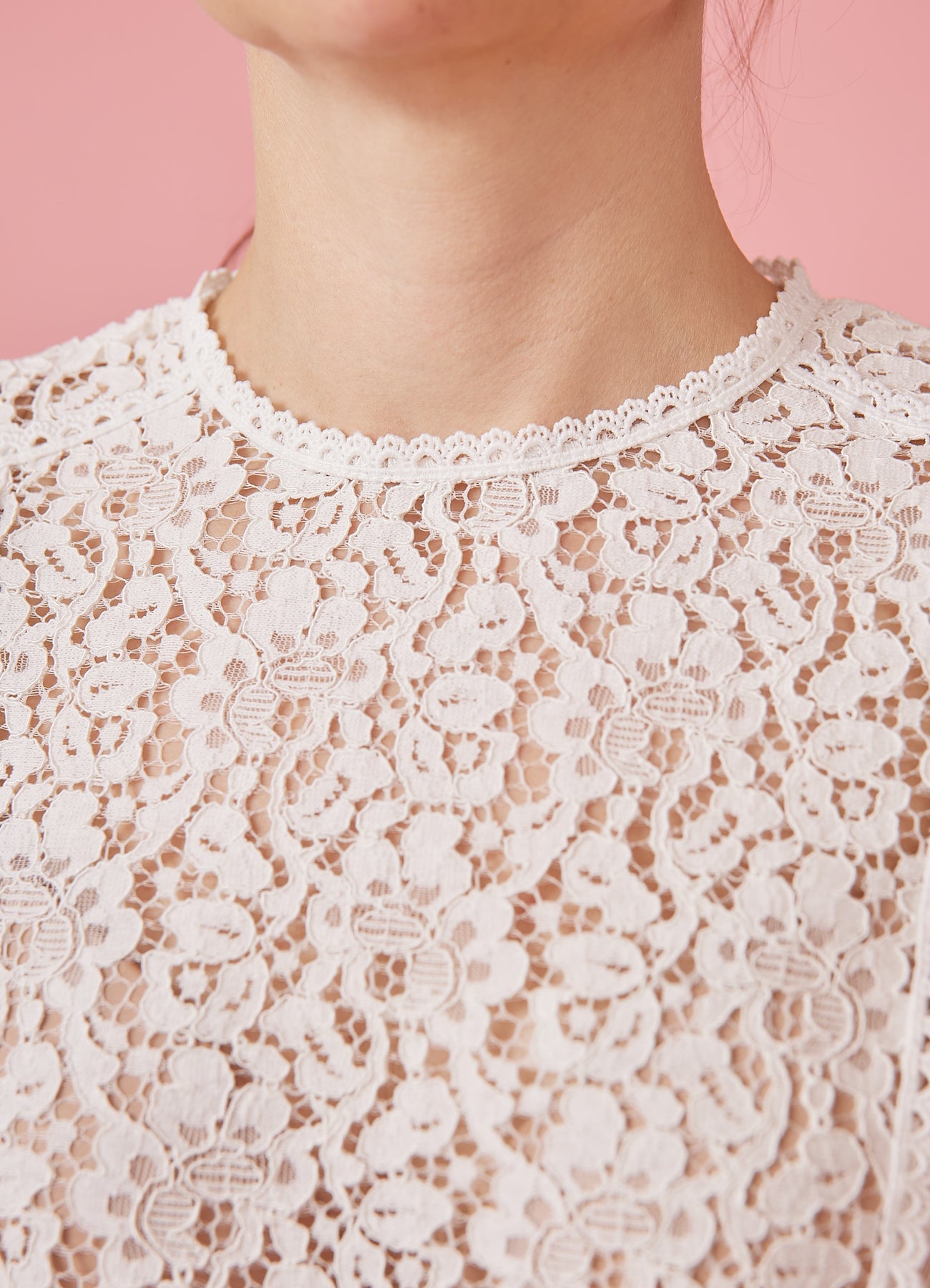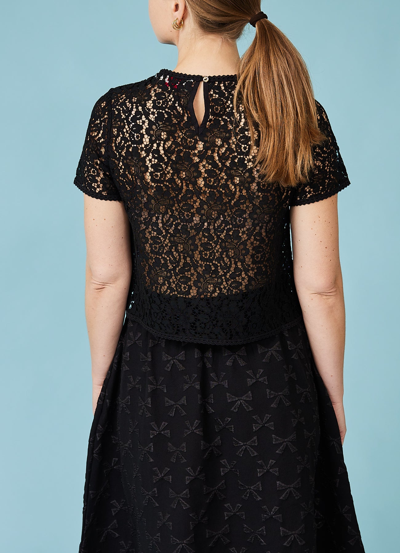 Elegant, feminin blondetop, som er perfekt til festlige lejligheder. Toppen har en tætsiddende halsudskæring med åbning i nakken, korte ærmer og fine blondedetaljer. Toppen er let figursyet uden at den sidder stramt.