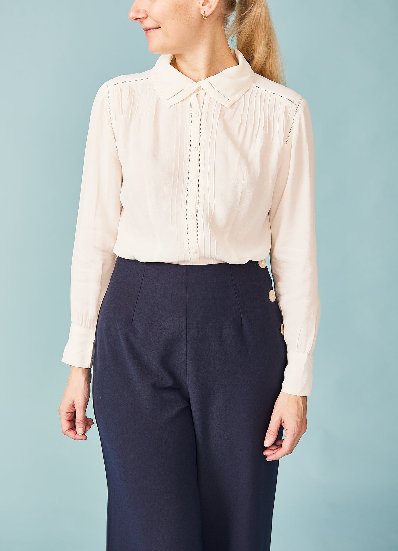 Smuk skjortebluse med lange ærmer i autentisk 1940'er-snit. Skjorten har syede læg på skuldrene og ned langs fronten, brede manchetter og en blød, afslappet krave med en fin mønster-detalje.