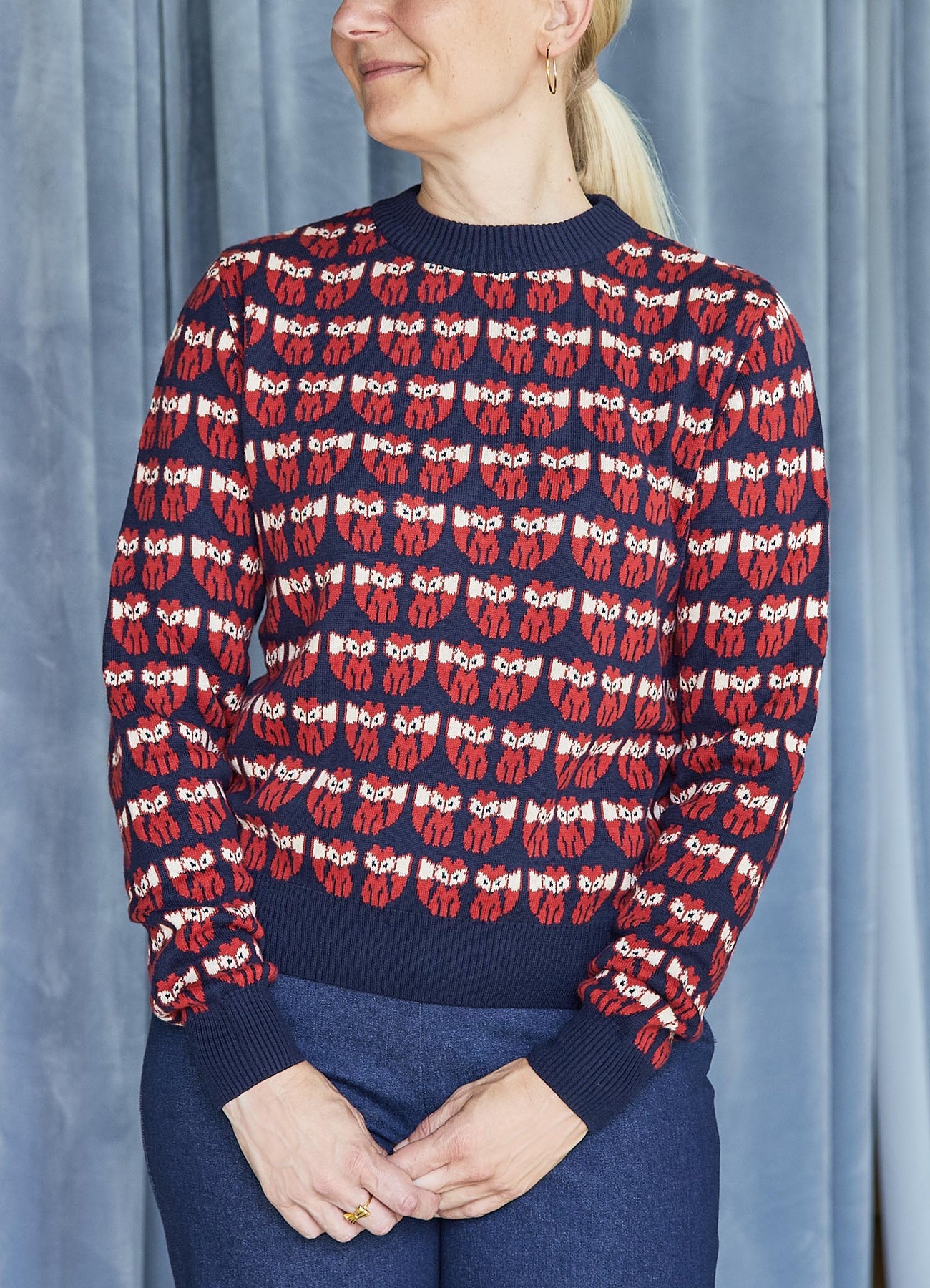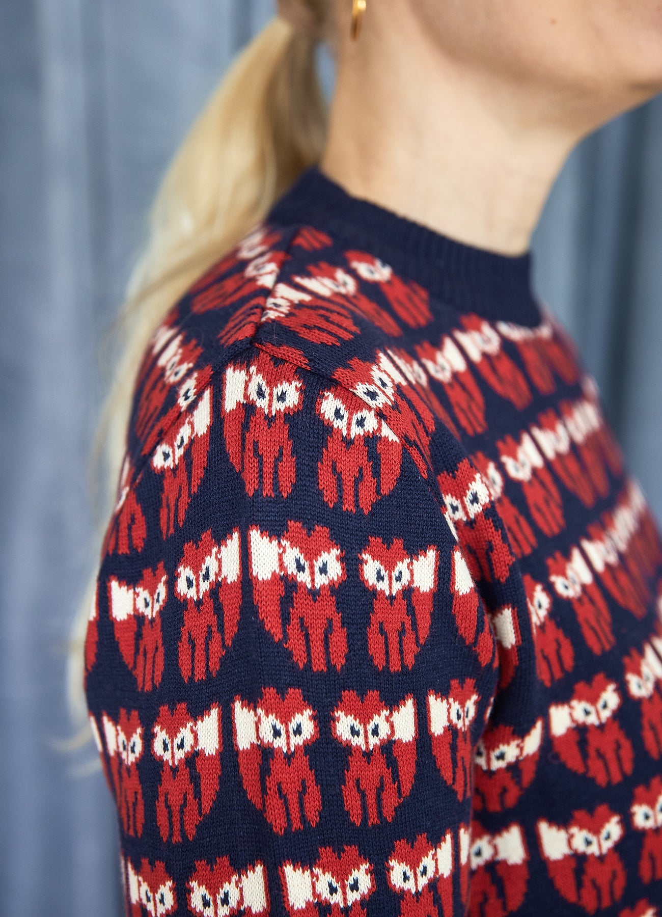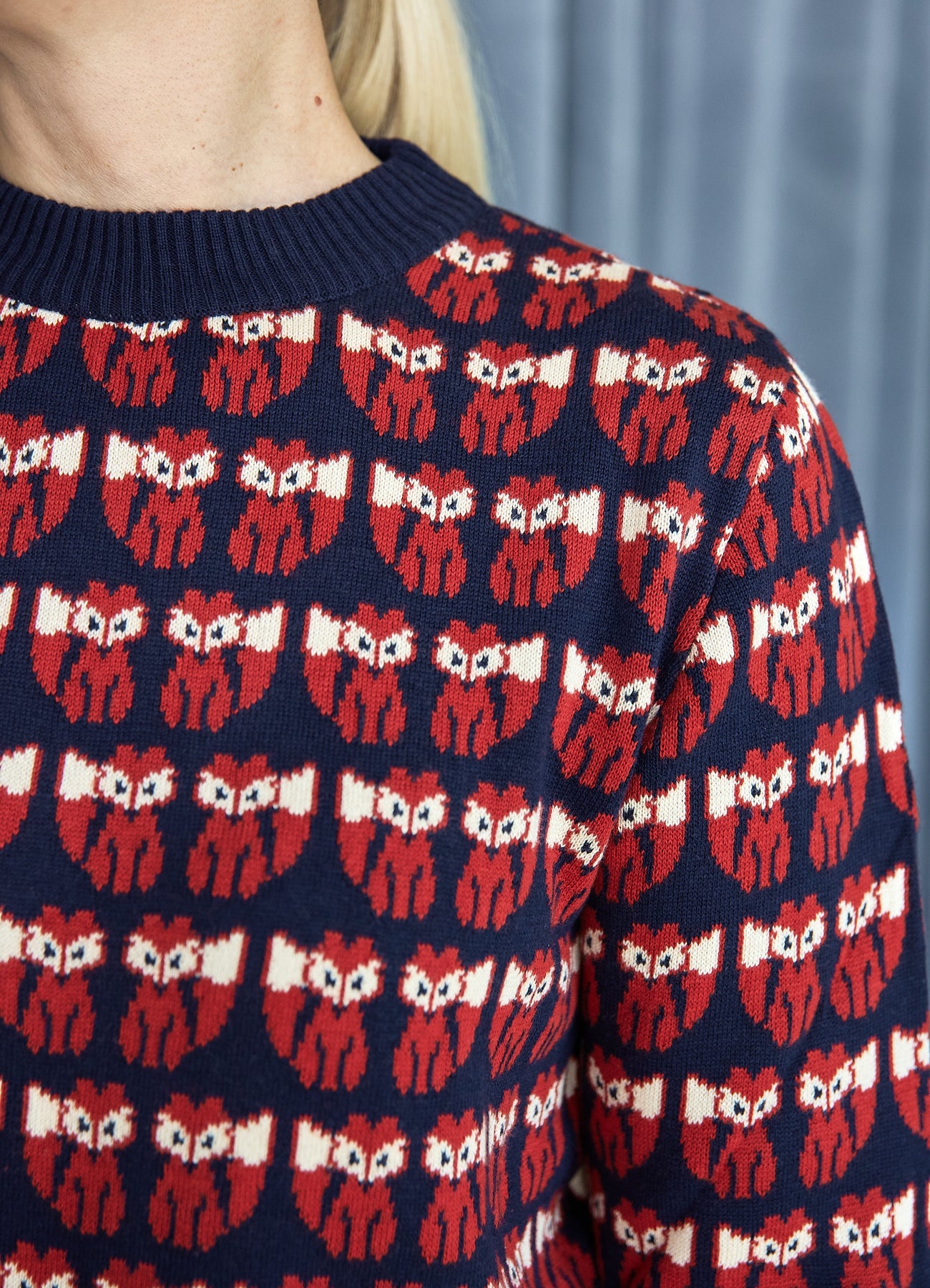 Blød jacquardstrikket bluse med røde ræve på en mørkeblå bund. Lavet i en lækker, kraftig kvalitet i 100% GOTS-certificeret bomuld.